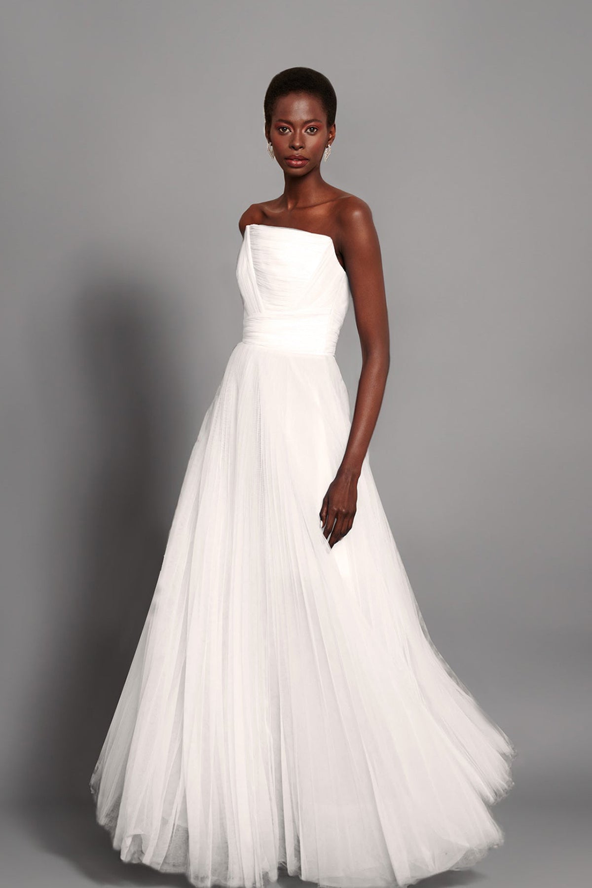 White A-line long dress. Featuring a thinly pleated hand-made 3D-dimensioned draped bust with a high-end line. Complemented with a wide pleated skirt in a French tulle-based fabric paired with 4% Lycra. Completed with a lined corset to create a well-fitted silhouette.