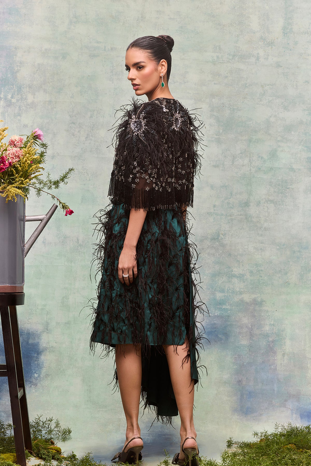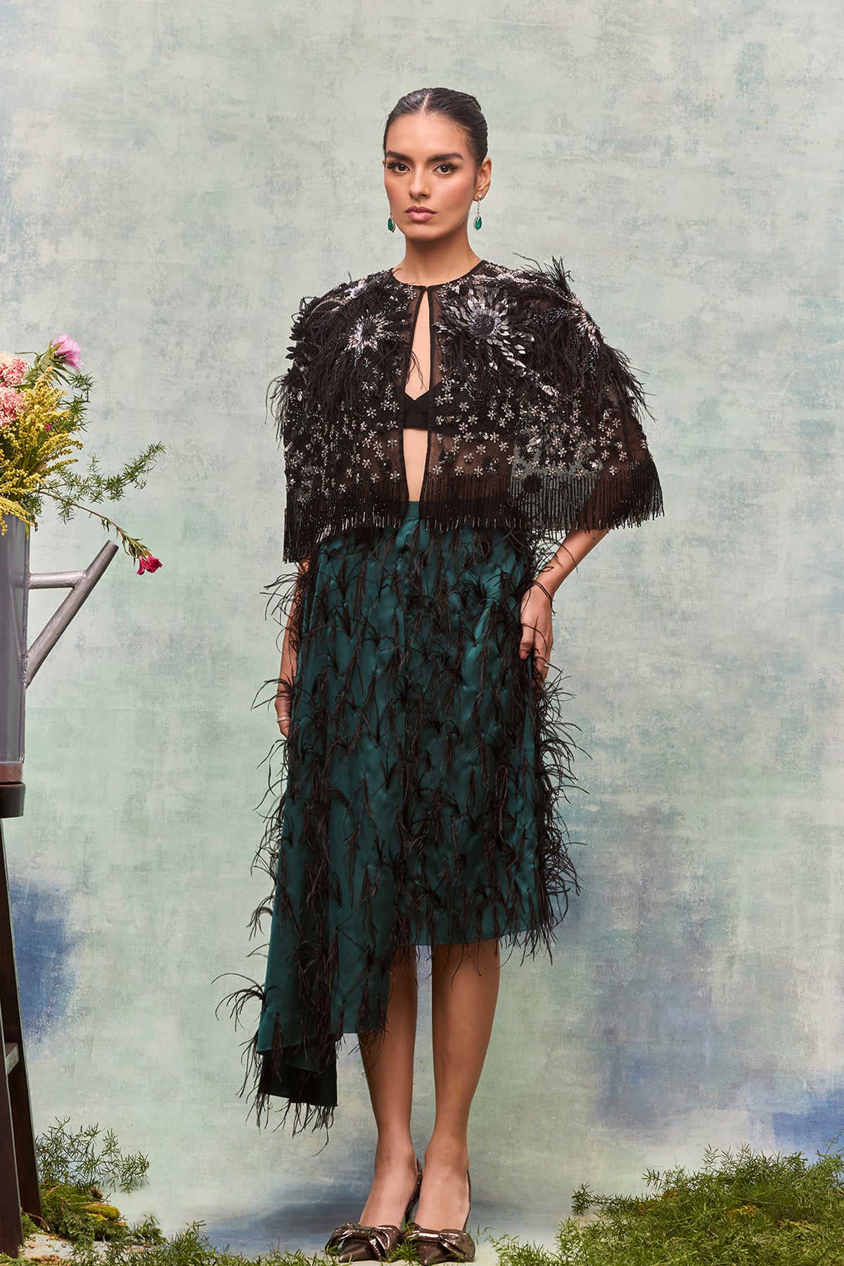 Multicolor midi ensemble. Featuring a V-neckline silhouette with a short cape a fitted bodice that flows into a draped slightly asymmetrical A-line skirt. Complemented with embroidery embellishment that add a tactile 3D effect and a gentle sparkle as light moves across the surface.