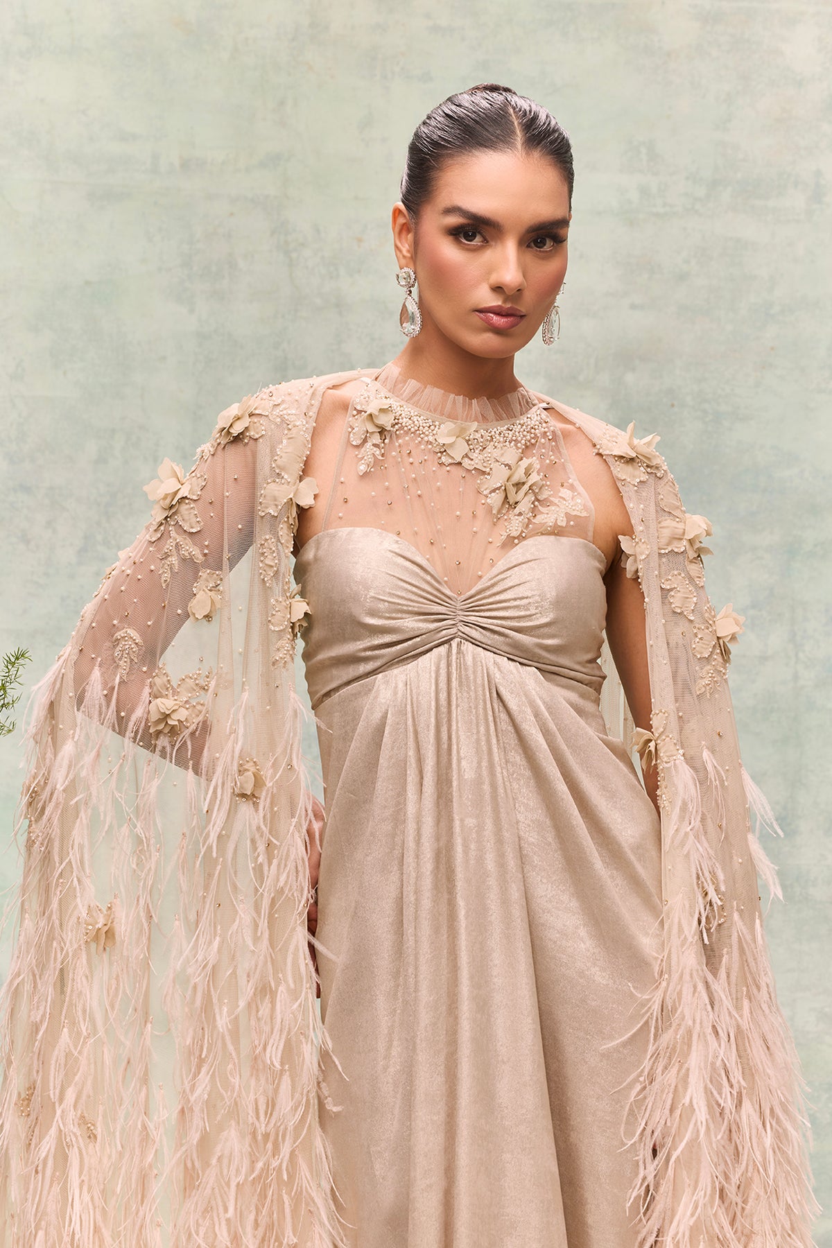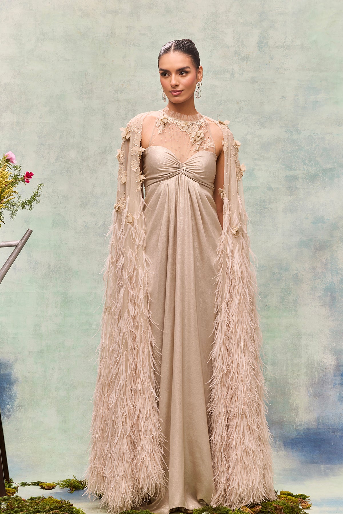 Champagne a-line floor-length. Featuring flowing skirt that extends to the ground with a cape floor-sweeping extending beyond the dress hem to create a towering. Complemented with ribbon belt floor-sweeping cape made of long-feathered.