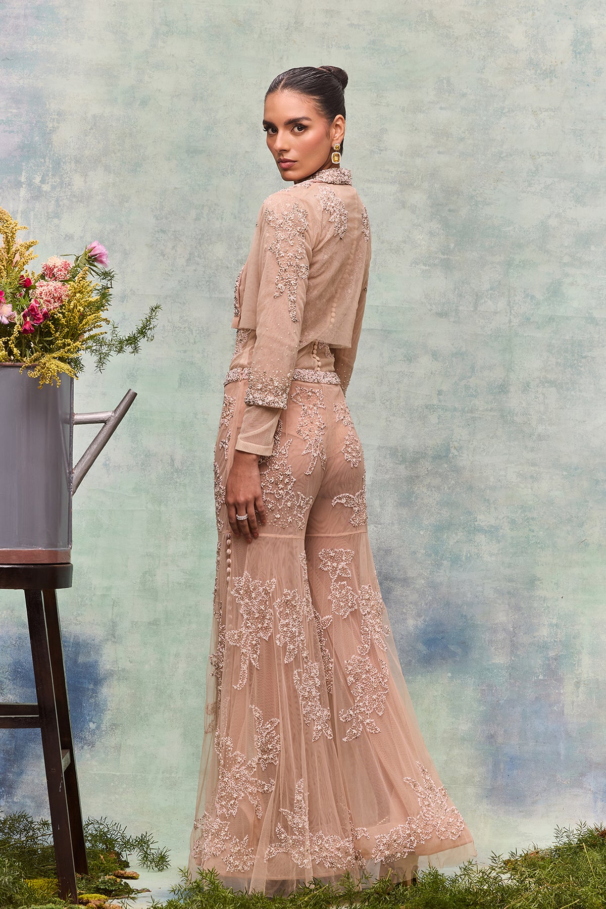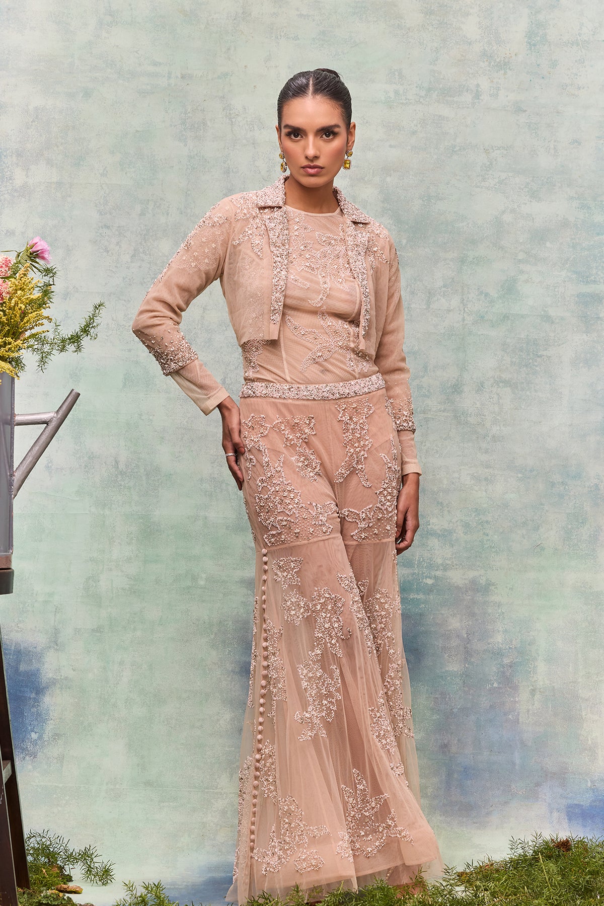 Blush tulle Silk Flared Pants. Featuring a polished contemporary silhouette with a cropped jacket with a classic collar and lapels and pearl bead abstract embroidery. Complemented with a refined and versatile piece. Completed with a bold statement that flared shape by the same pearl and bead embroidery in an abstract motif.