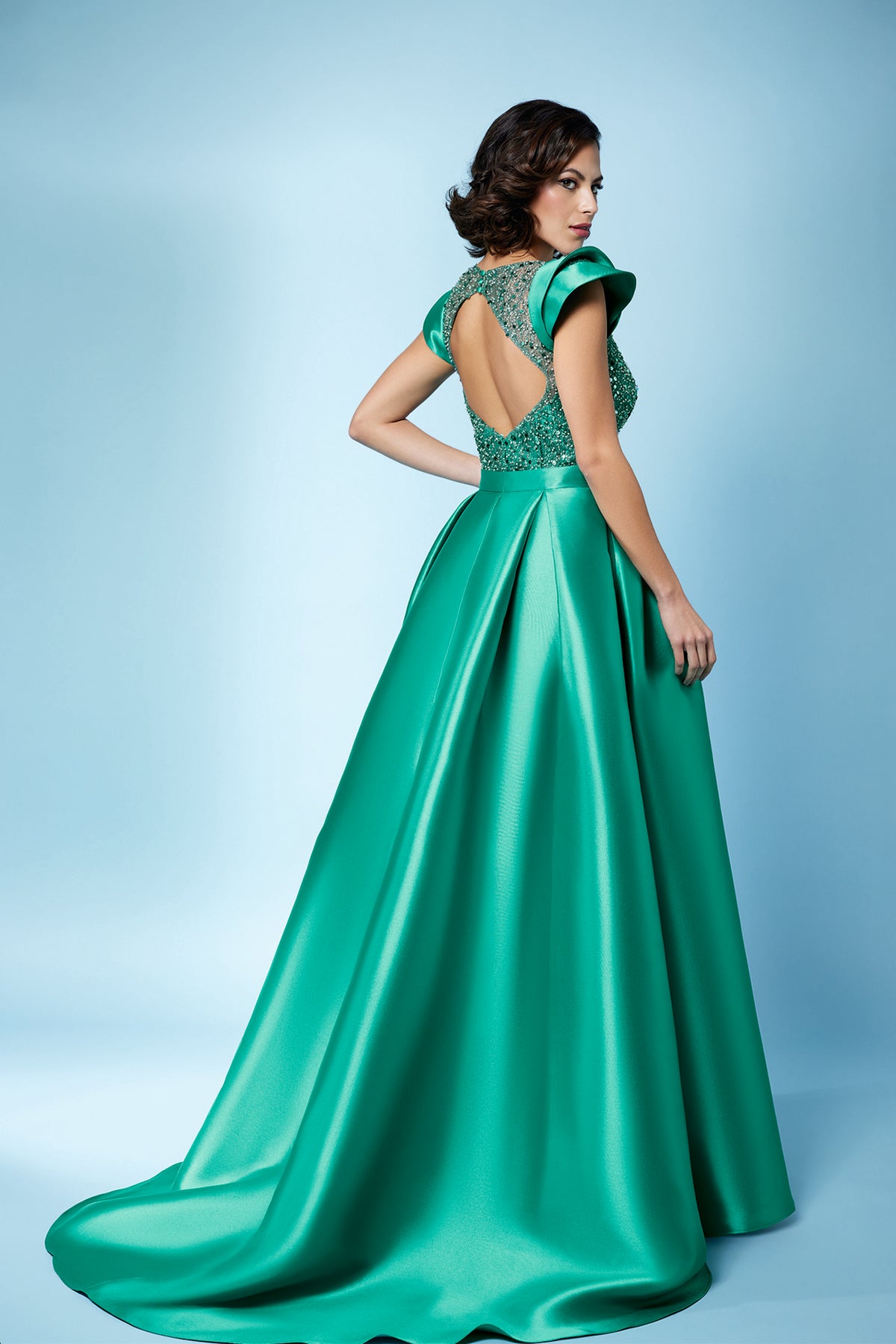 Green short-sleeved dress. Featuring a variety of beaded fabrics, with a deep front neckline and diamond-shaped back slit. Complemented with plain shoulder pads with double ruffles. Completed with a large micado overskirt with pleats matching the shoulder pads of the dress.