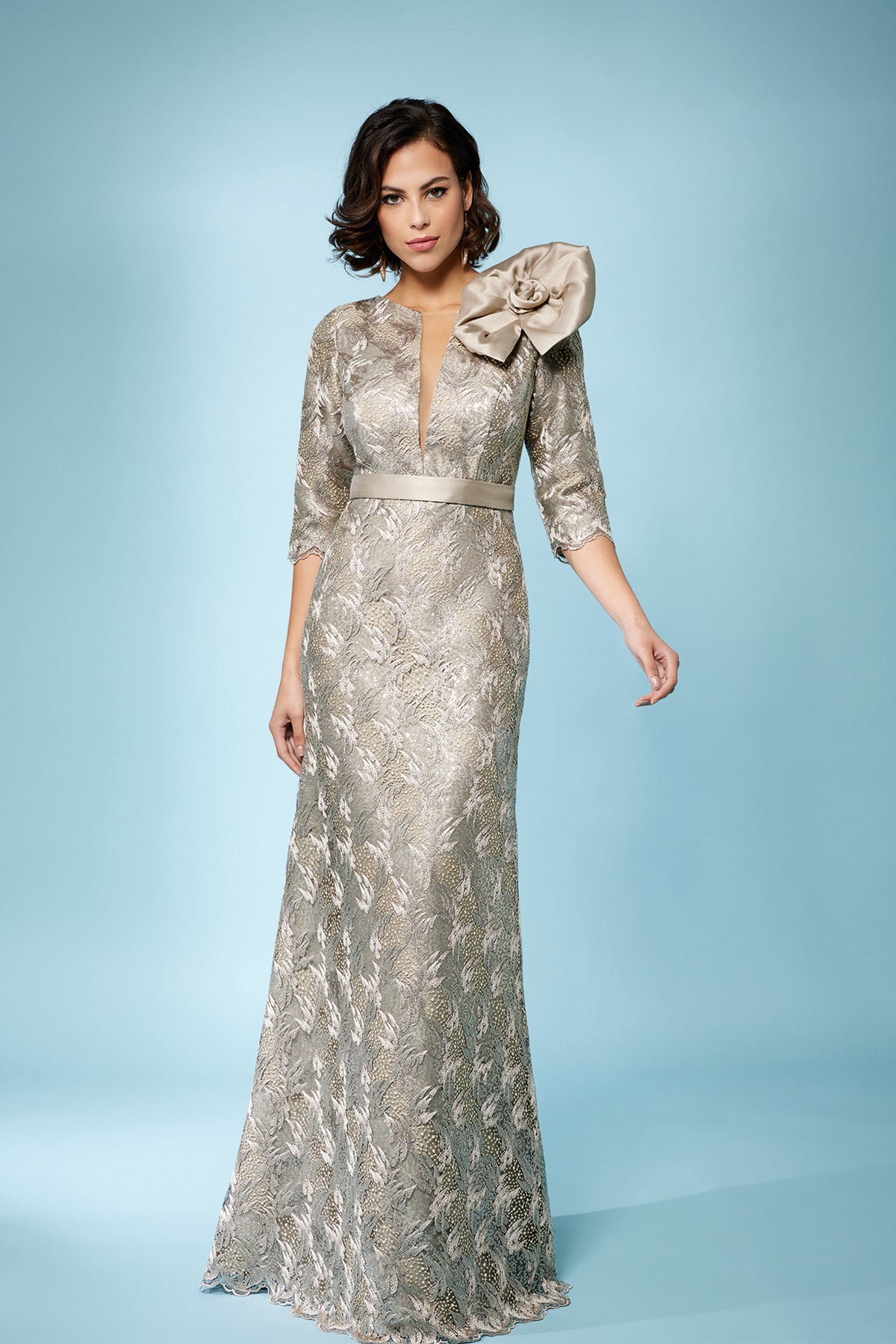 Metallic silver tulle mermaid dress. Featuring a pointed hem, with a deep V-neckline adorned with a large, matching flower.