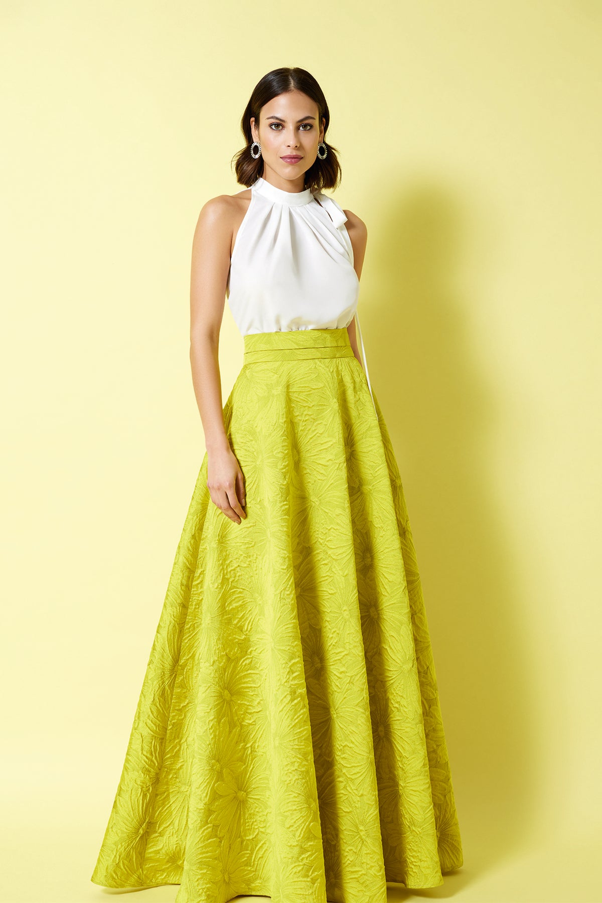 Yellow-green and white two-pieces. Featuring a chiffon halterneck top tied with a bow and brocade cape skirt.