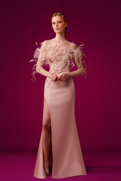 Soft pink dress featuring sheer tulle on the bust adorned with sequins, Swarovski crystals, and feathers. The top with long sheer sleeves showcases an asymmetrical line pattern embroidery that extends to the skirt’s slit. Complemented with a mermaid skirt, and a thigh-high front side slit.