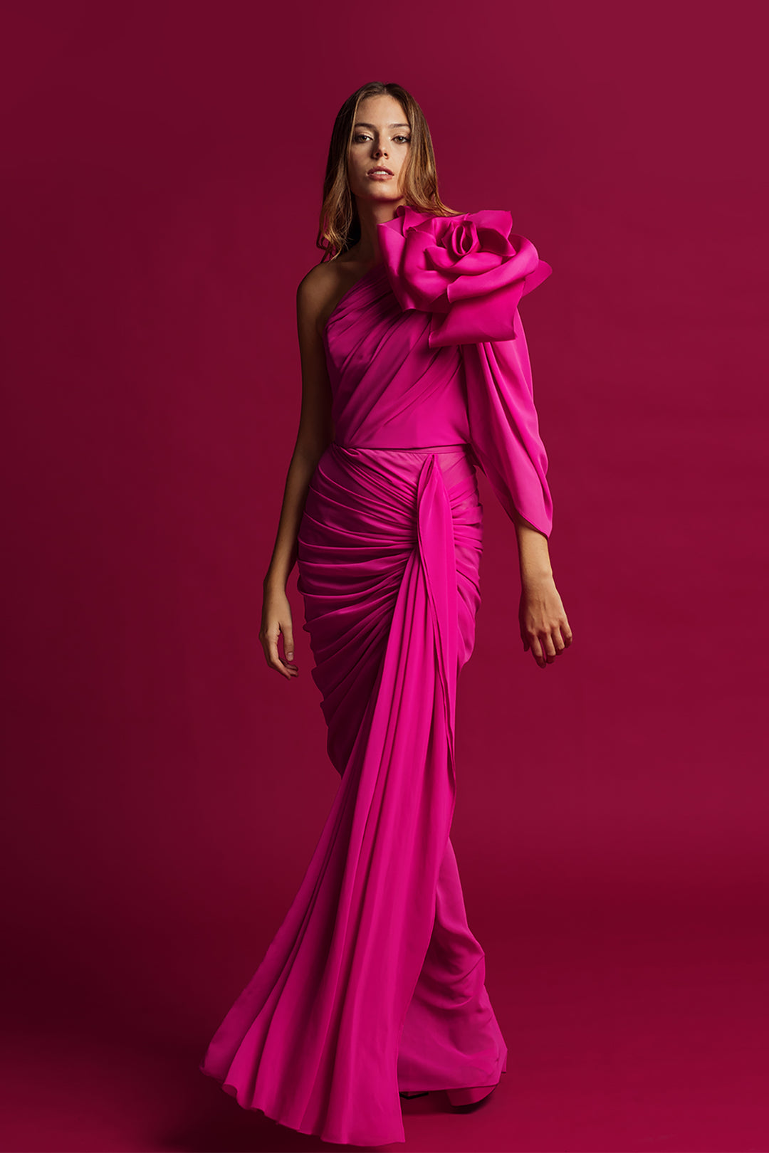 Fuchsia one-shoulder draped dress. Featuring an asymmetric neckline, one long draped sleeve, and a draped bodice. Complemented with a large flower on the shoulder, a draped fitted skirt with gathering details around a cascading pleated fabric.