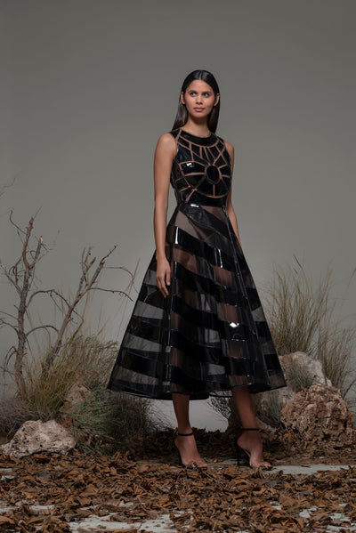 Black sleeveless A-line midi dress. Featuring a jewel neckline, a fitted bodice, and an A-line midi skirt. The dress is crafted from black sheer tulle, with black geometric patterns all over.