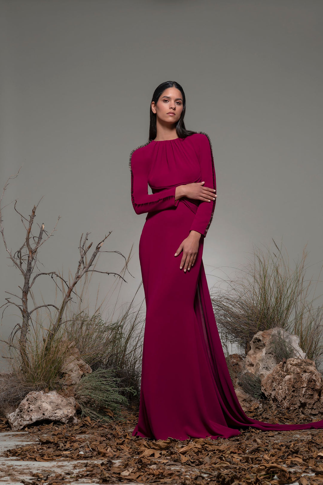 Dark pink long-sleeved mermaid dress. Featuring a jewel neckline adorned with gathering details, and long fitted sleeves with spikes along the sides. Complemented with a fitted bodice, and a mermaid skirt, with a back train.