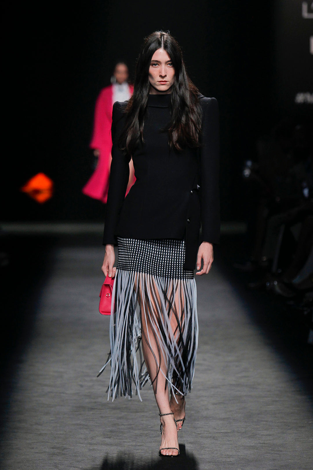 Black jacket suit, featuring a closed neckline, and a V-shaped open back with lapels at the back, and pockets. The jacket has an asymmetric cut. Complemented with a blue and black skirt made of horsehair, with a shredded cuts hemline.