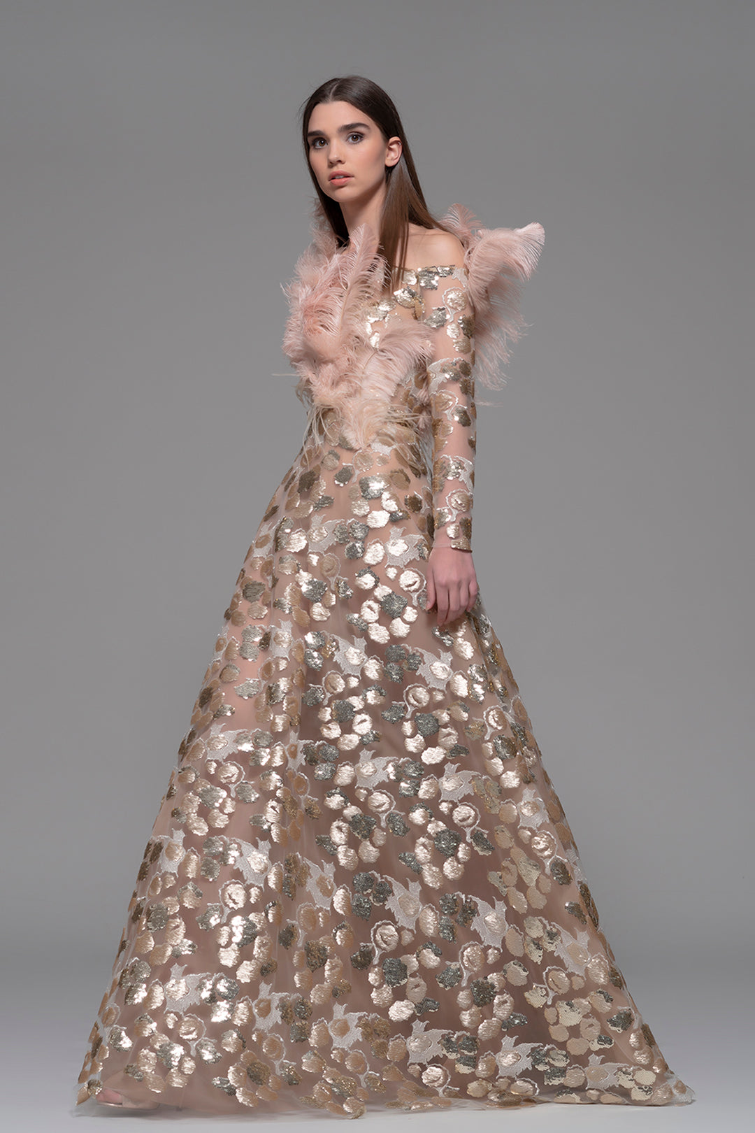Gold and powder pink off-the-shoulder long-sleeved A-line dress. Featuring fitted sleeves, and a fitted bodice adorned with light pink feathers. Complemented with a voluminous A-line skirt. The dress crafted from a tulle based and is fully embellished with shades of gold patterns.