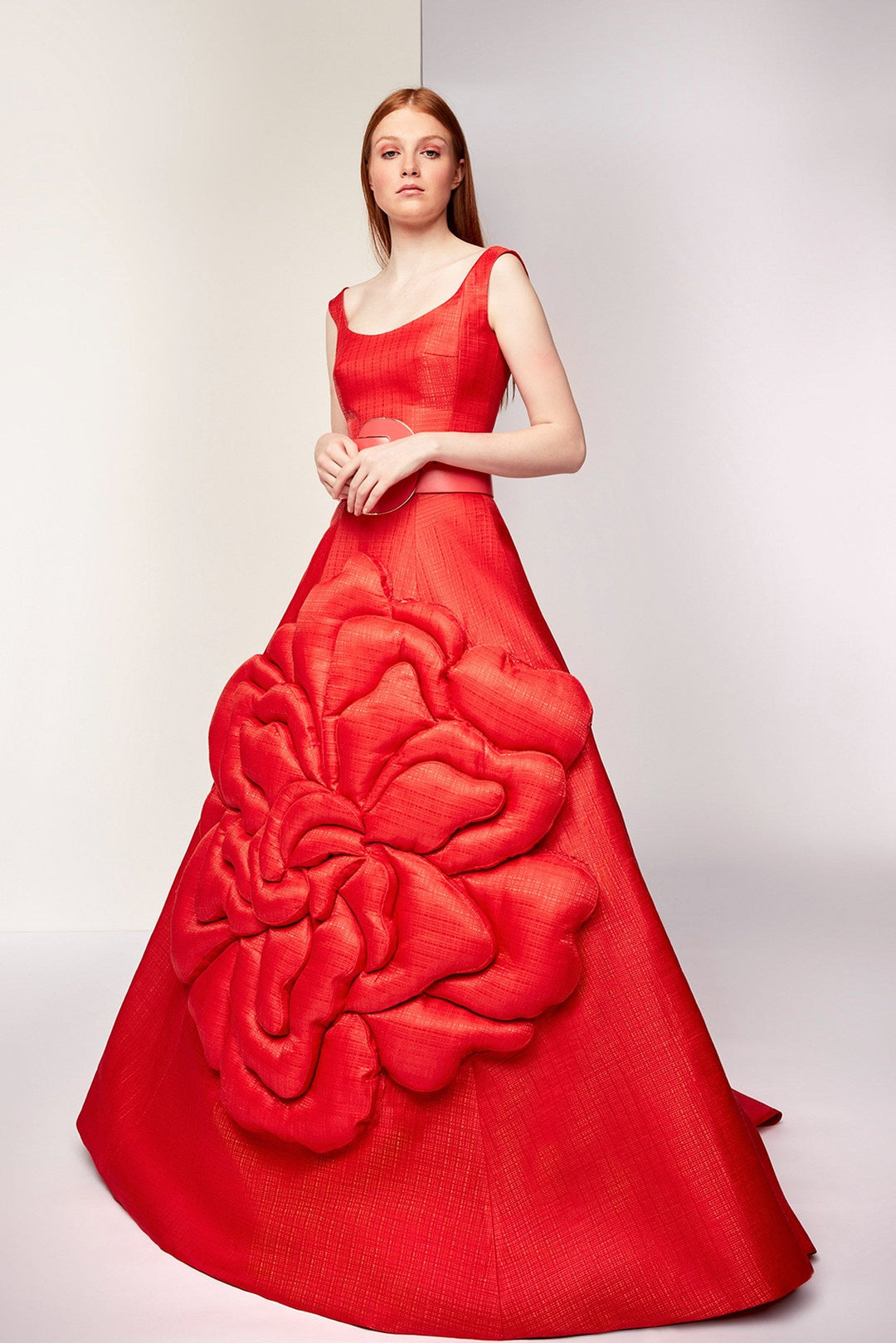 Red sleeveless princess dress. Featuring a round neckline, a fitted bodice, and a waist belt. Complemented with a voluminous princess-cut skirt that has a large ruffle on the front of it in the shape of a rose.