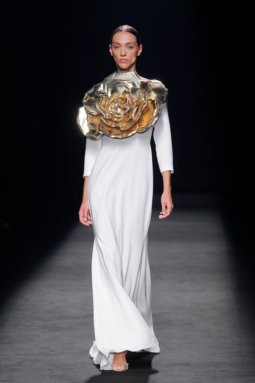 White long-sleeved flared loose dress. Featuring a high neckline adorned with a large gold rose that takes over the bodice, long sleeves, and a fitted bodice. Complemented with a flared loose skirt.