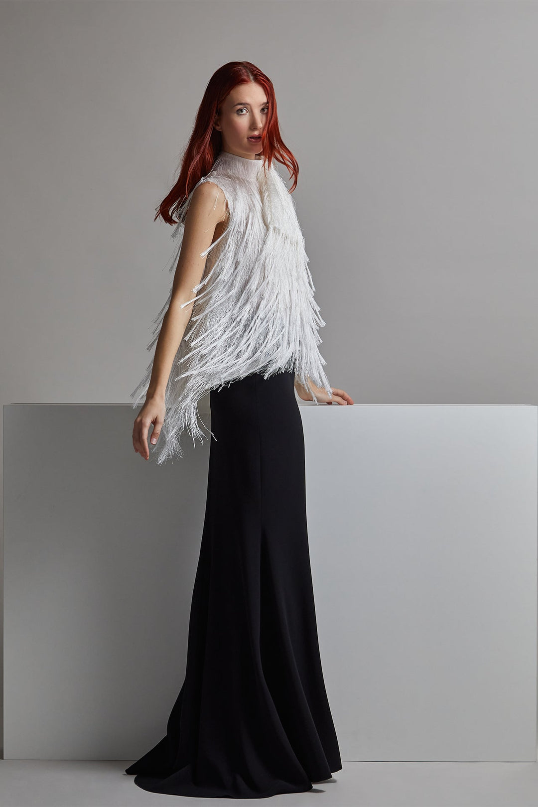 Light gray sleeveless fringed loose top. Featuring a high neckline. Complemented with a black mermaid skirt that flows into a sweep train.