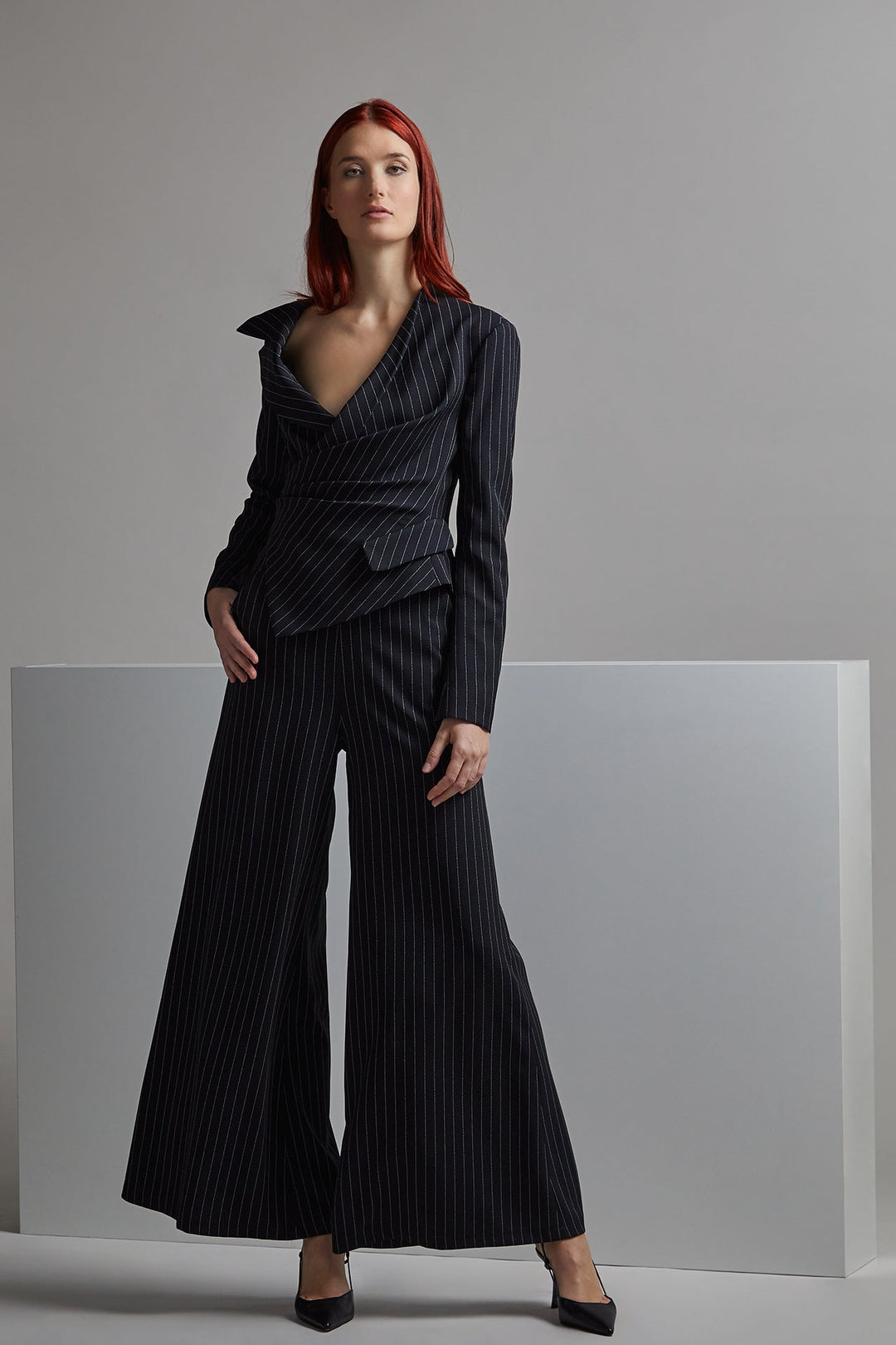 Black striped jumpsuit. Featuring an asymmetric wide neckline, long sleeves, and a lapel on one side of the shoulder. Complemented with a fitted bodice, and a side pocket. Completed with wide-legged ankle-length pants. The jumpsuit has a blazer-like effect.