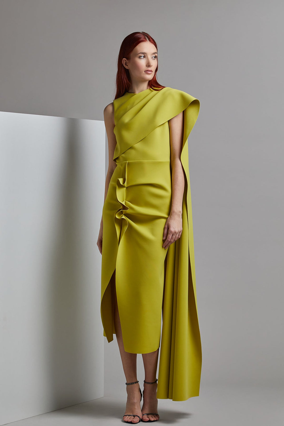Yellow cape midi dress. Featuring a jewel neckline, and a draped bodice with gathering details around the neckline that transforms into a side cape one side of the shoulder. Complemented with a straight-cut midi skirt, with a front side slit adorned with small ruffles.