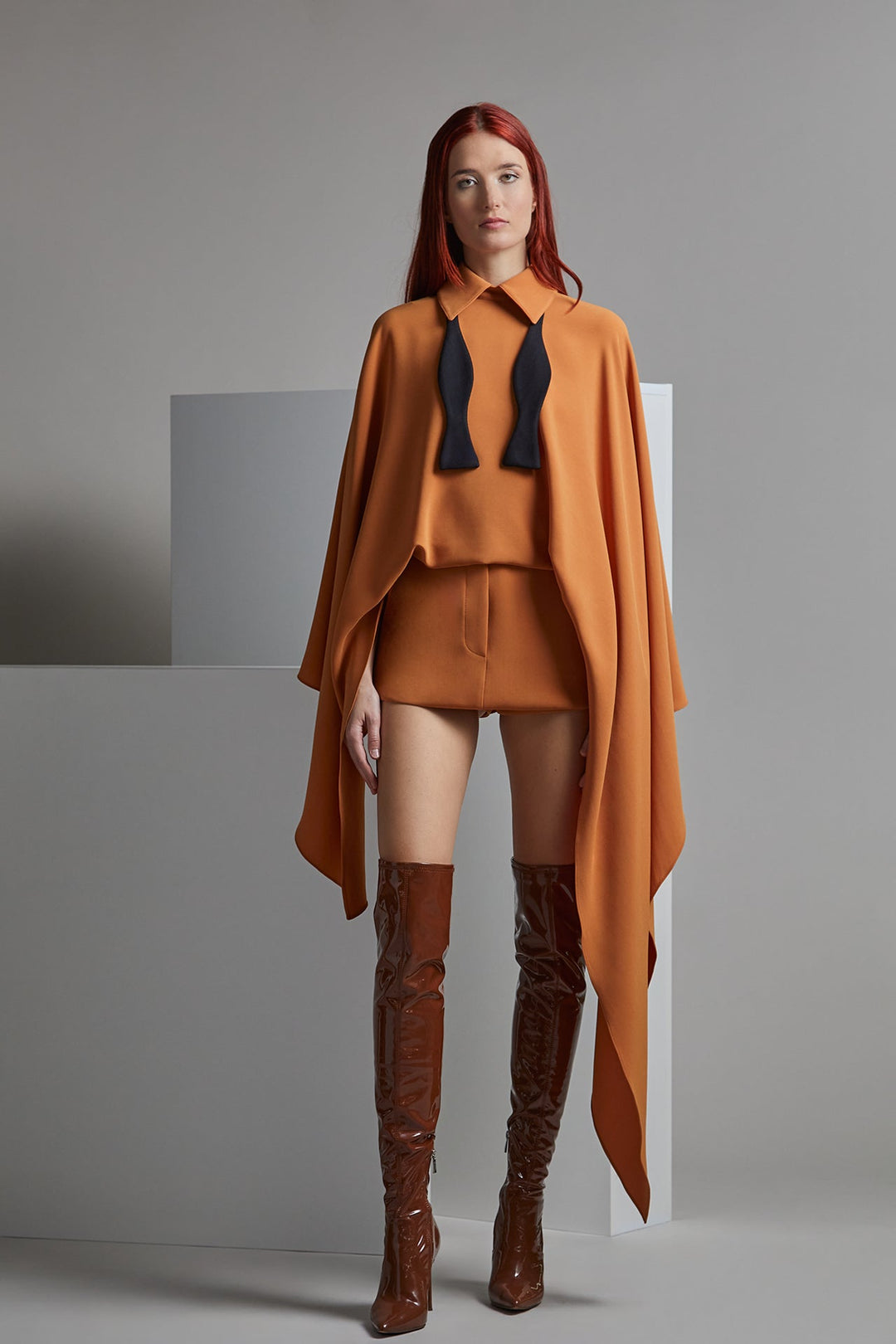 Orange cape shirt. Featuring a collared neckline, and a cape bodice with cape sleeves, one sleeve is longer than the other. Complemented with an orange mini skirt.