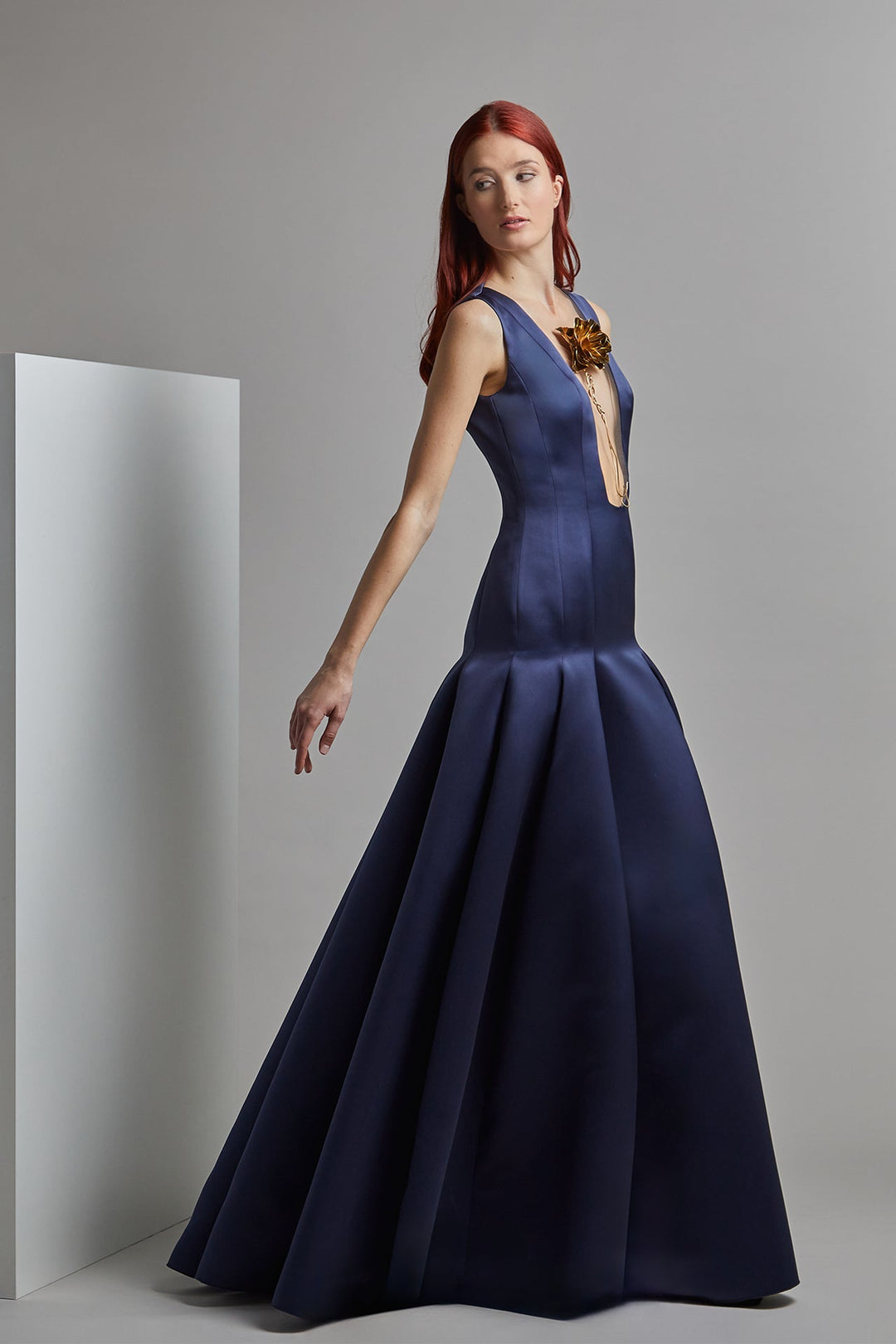 Navy blue sleeveless A-line dress. Featuring a plunging sheer V neckline, and an orange flower on the chest. Complemented with a fitted bodice, and an A-line skirt that’s tight around the hips and then flares out floor-length.