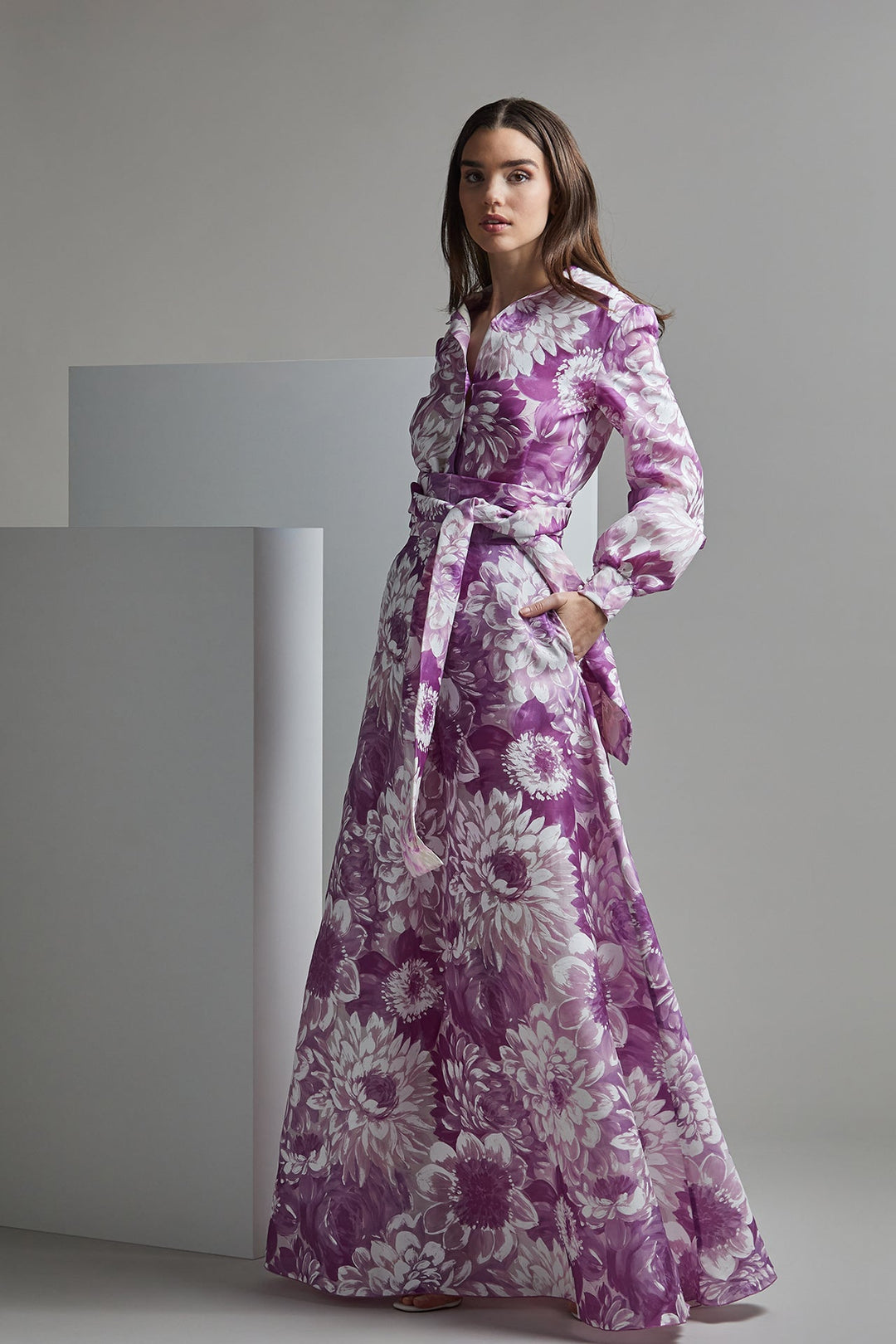 White and purple long-sleeved floral printed dress. Featuring a V neckline, lapels, and long slightly puffy sleeves with fitted cuffs. Complemented with a waist ribbon, and an A-line skirt with side pockets.
