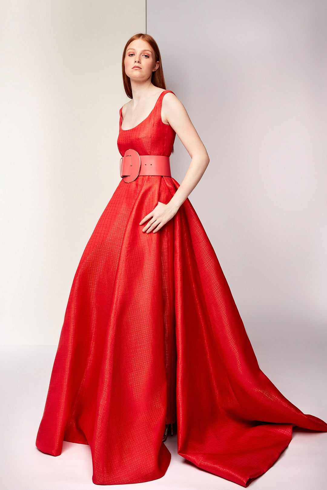 Red sleeveless princess dress. Featuring a round neckline, a fitted bodice, and a waist belt. Complemented with a thickly pleated princess-cut skirt.