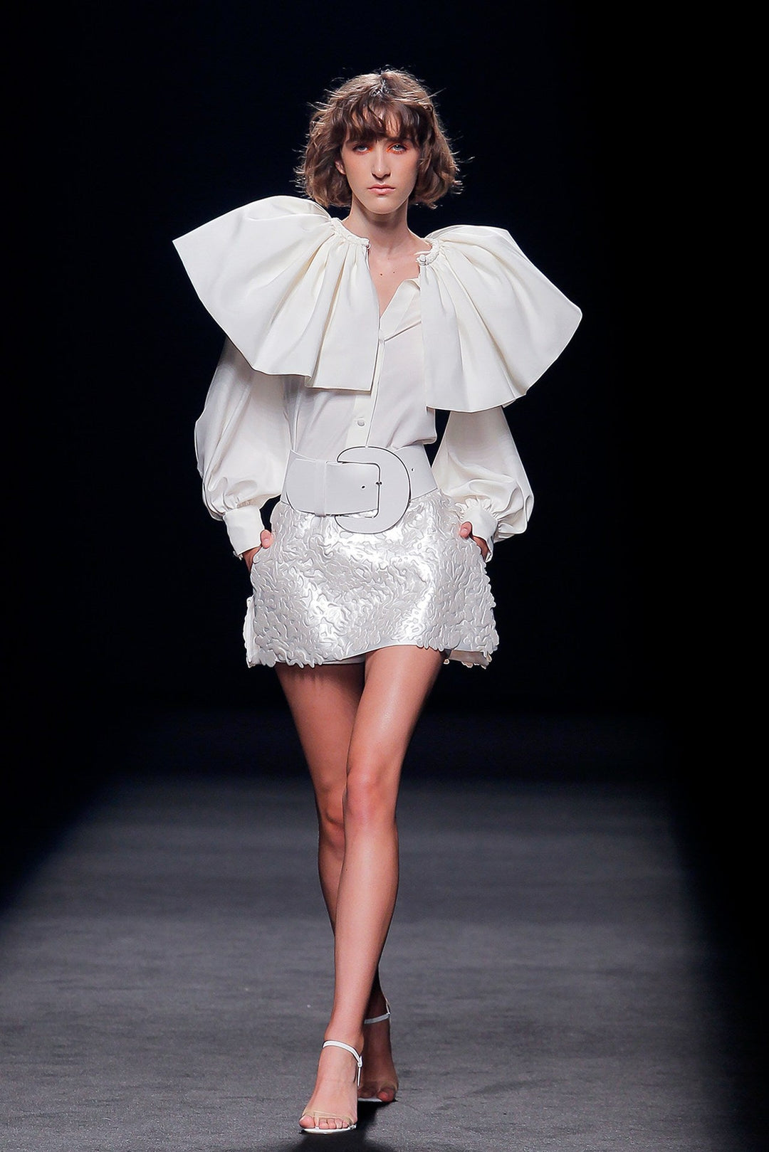 Ivory puffy shirt. Featuring a V neckline adorned with a ruffled collar. Complemented with slightly puffy sleeves and fitted cuffs. Complemented with a waist belt, and a mini skirt with side slip pockets.