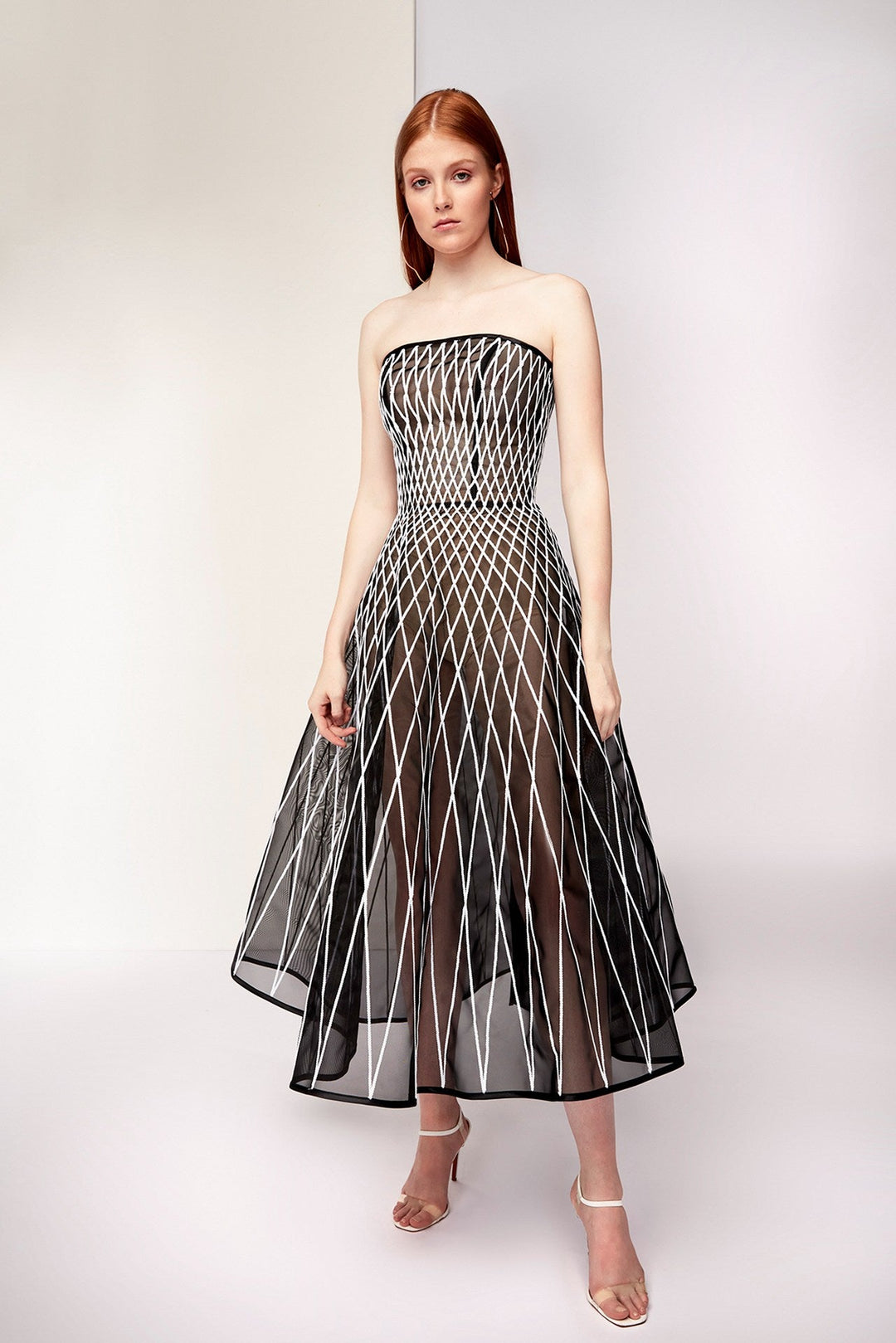 Black and white strapless see-through A-line midi dress. Featuring a straight neckline, a fitted bodice, and a voluminous A-line skirt. The dress has a black base, and white geometric lines all over.