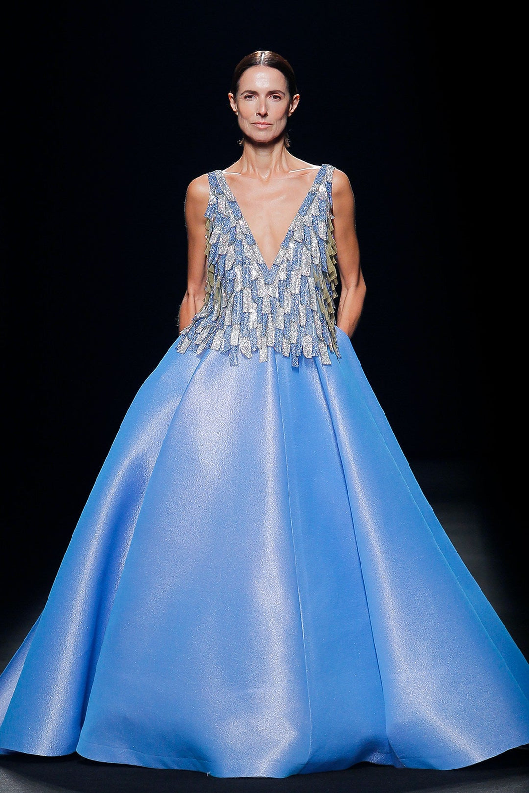 Blue sleeveless oversized princess dress. Featuring a V neckline, an embroidered bodice with thick fringed in metallic blue and gold. Complemented with an oversized waist, and a princess-cut skirt with side slip pockets.