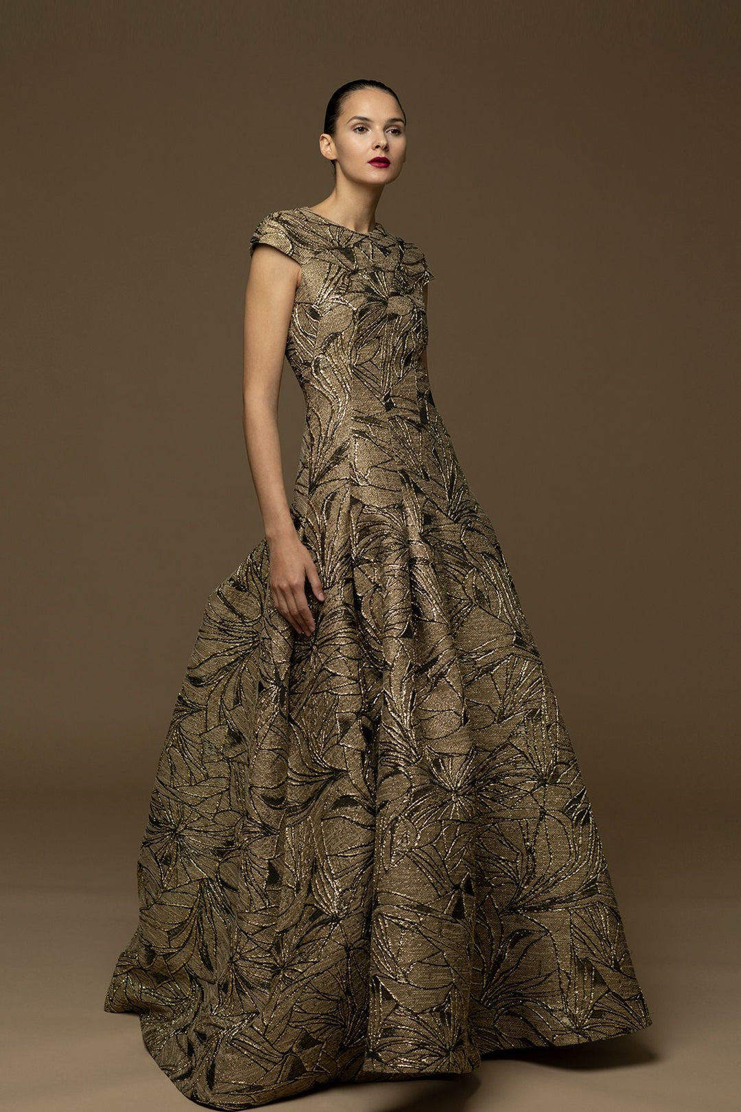 Beige and gold embroidered sleeveless A-line dress. Featuring a jewel neckline, cap sleeves, and a fitted bodice. Complemented with an A-line voluminous skirt that’s tight at the hips, and then flared out from the hip to the floor.