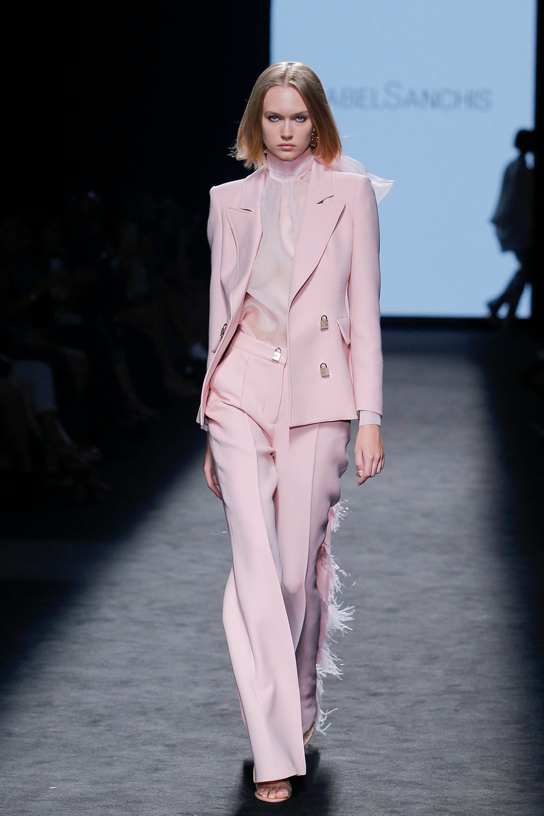 Light pink suit. Featuring a button less shirt, with a high neckline ties at the back with a bow detail. Complemented with a blazer, long sleeves, and lock-design buttons. Completed with flared pants, and fringed detailing on one side of the pants.