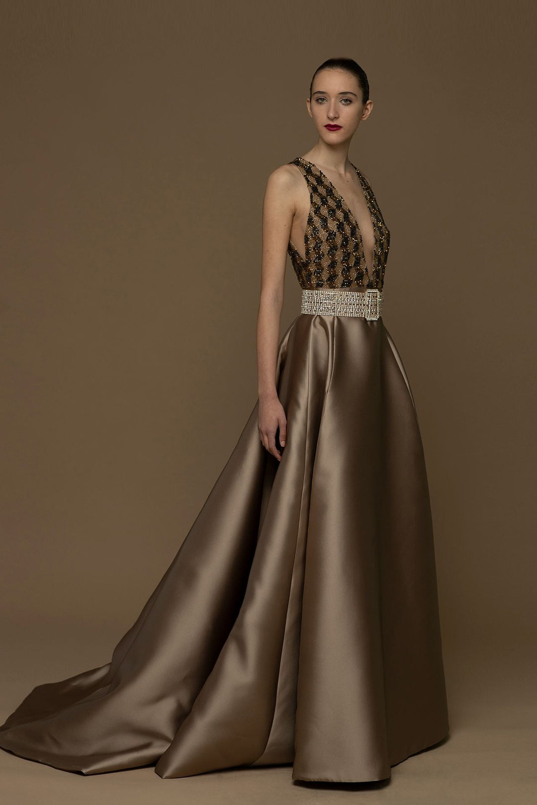 Gold and beige sleeveless A-line dress. Featuring a plunging V neckline, and a fitted bodice that’s crafted from black and gold metallic geometric lines. Complemented with a light gold waist belt, and a beige A-line skirt that flows into a sweep train.