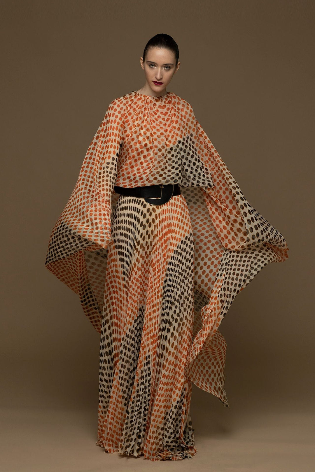Orange and black polka dot long-sleeved flared dress. Featuring a jewel neckline, batwing sleeves that form a cape from the back that flows along the length of the dress, and a loose bodice. Complemented with a black waist belt, and a flared A-line skirt. The dress has orange and black polka dots.