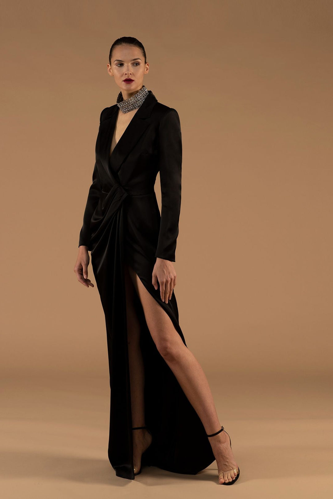 Black blazer envelope fitted dress. Featuring a V neckline, lapels, and long fitted sleeves. Complemented with an envelope skirt that ties around the waist into a bow. Completed with a front side slit, and gathering details around the center.