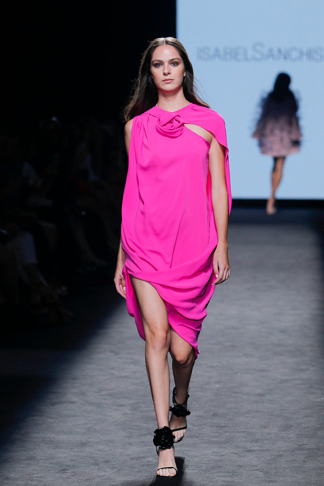 Pink draped short dress. Featuring a jewel neckline, with a floral design on the neck, and a draped short skirt. One of the sleeves flows from the shoulder at the back of the dress, then connects to the hemline, giving the draping effect.