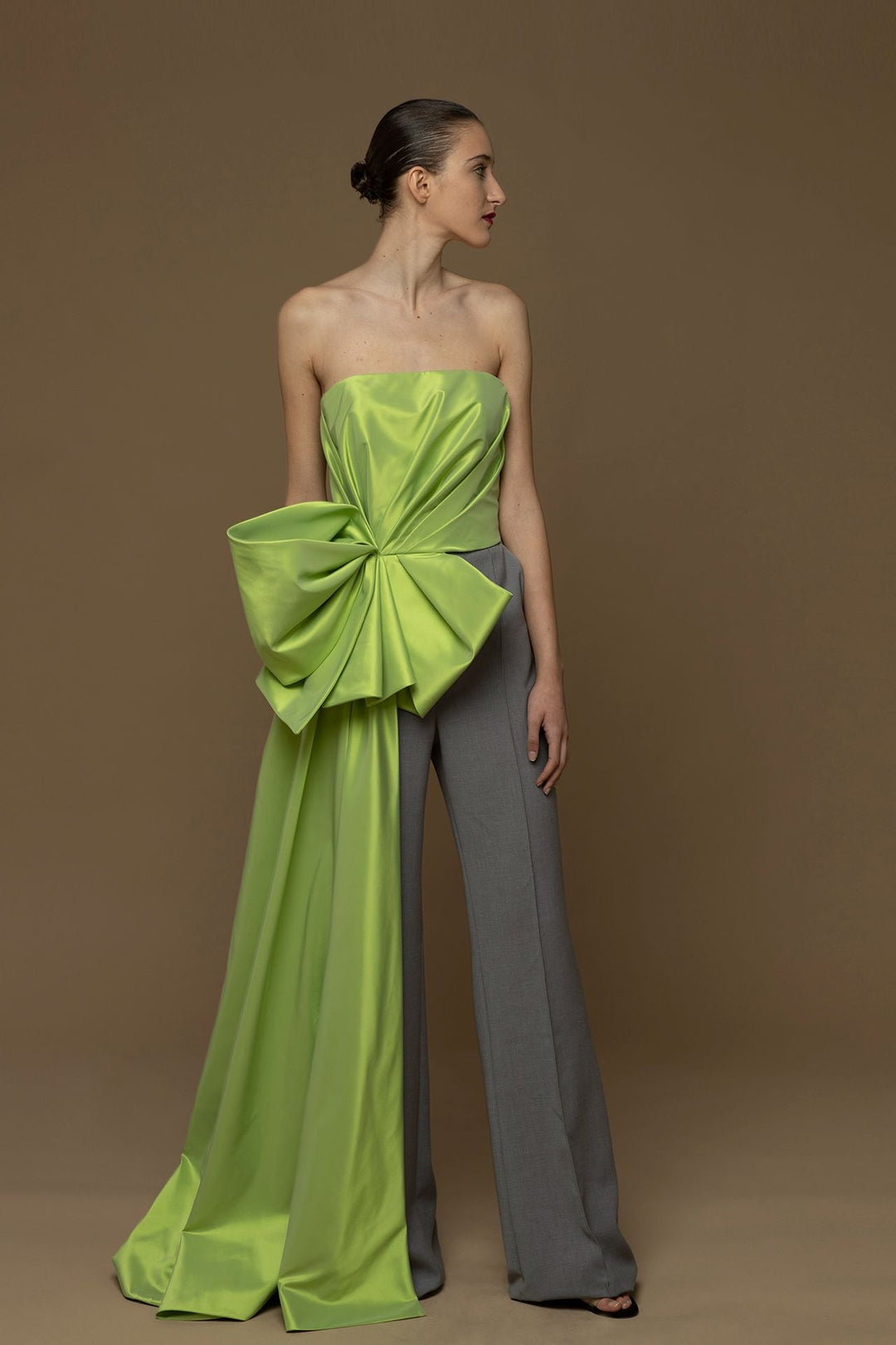 Lime green strapless draped top. Featuring a straight neckline, a draped fitted bodice, and a boy on the side of the waist that flows down to the floor. Complemented with gray flared pants.