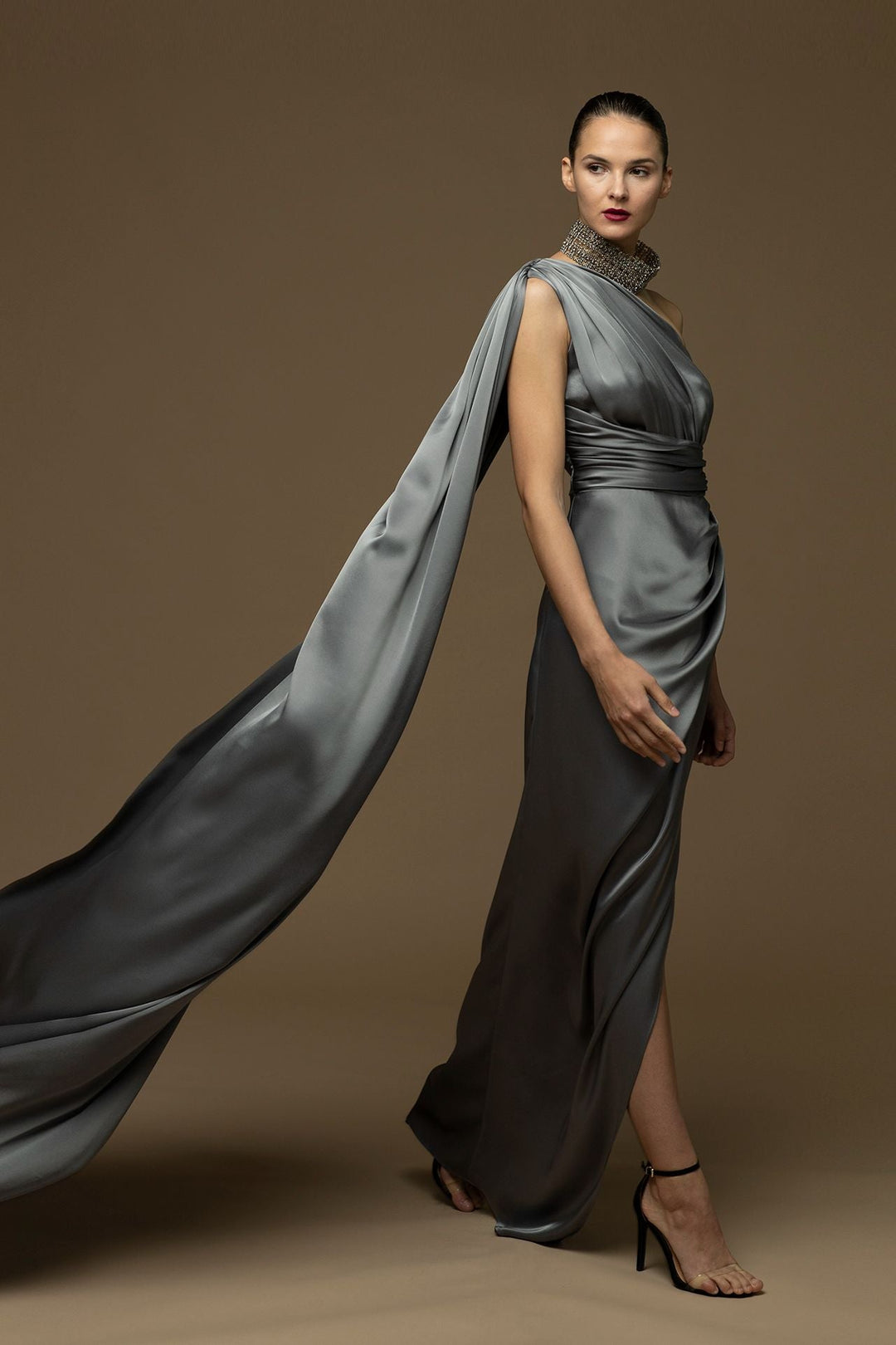 Gray one-shoulder draped fitted dress. Featuring an asymmetric neckline, a sleeveless shoulder with a side cape that flows to the floor, and a fitted draped bodice. Complemented with a pleated banded waist, and a draped fitted skirt with a side slit.