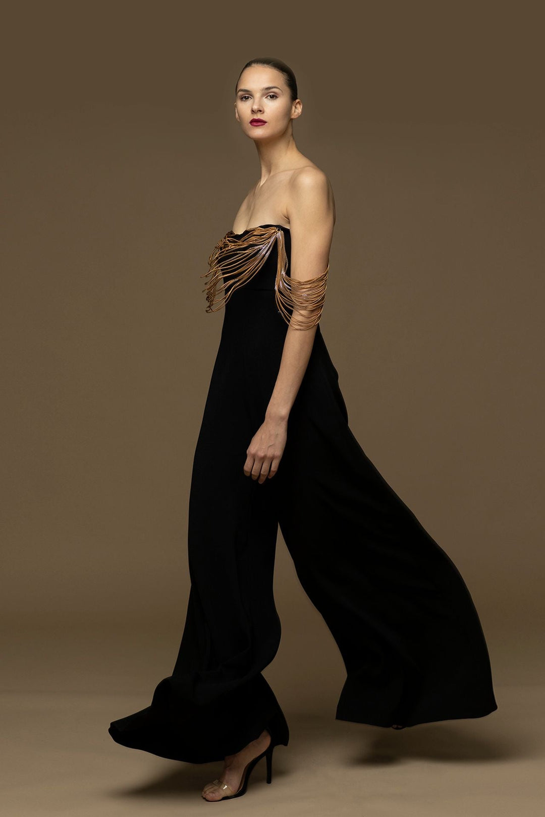 Black off-the-shoulder flared jumpsuit. Featuring a straight neckline adorned with golden chains, that continue into draped off-the-shoulder sleeves. Complemented with a fitted bodice and wide-legged pants.