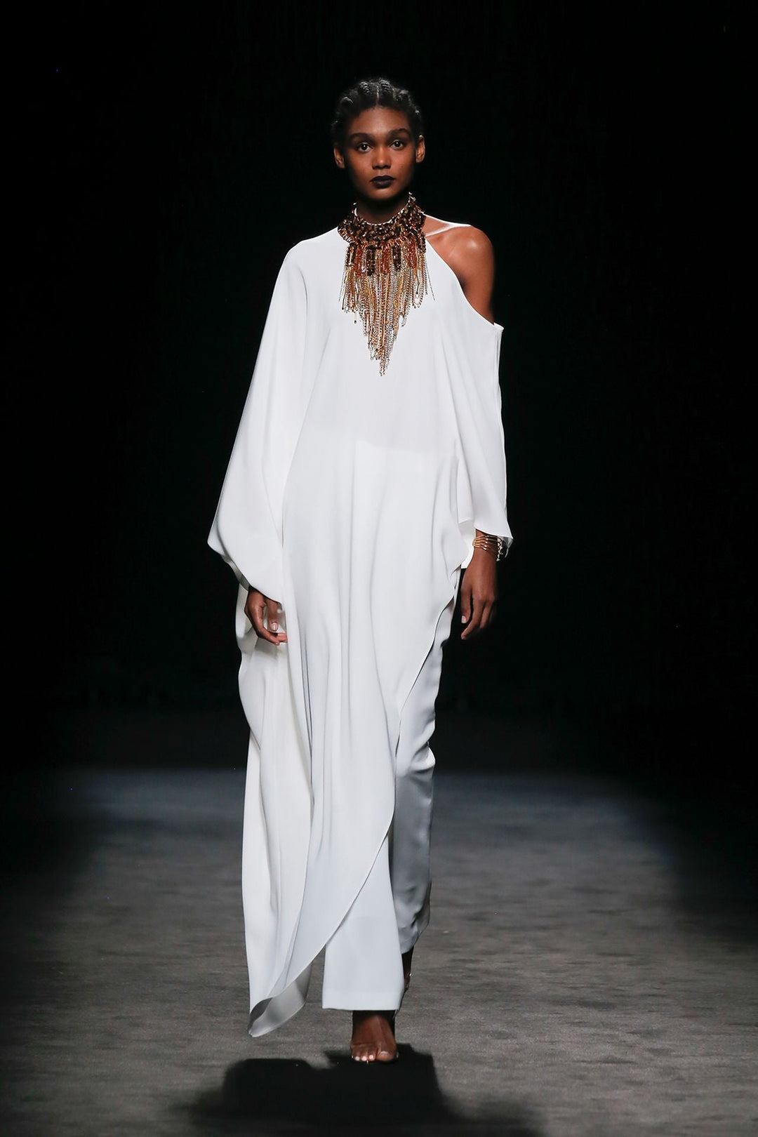 White loose long blouse, featuring a long batwing sleeve, and a cold-shoulder sleeve. Complemented with a bronze ornament around the neck, and one side shorter than the other. Completed with pencil pants.