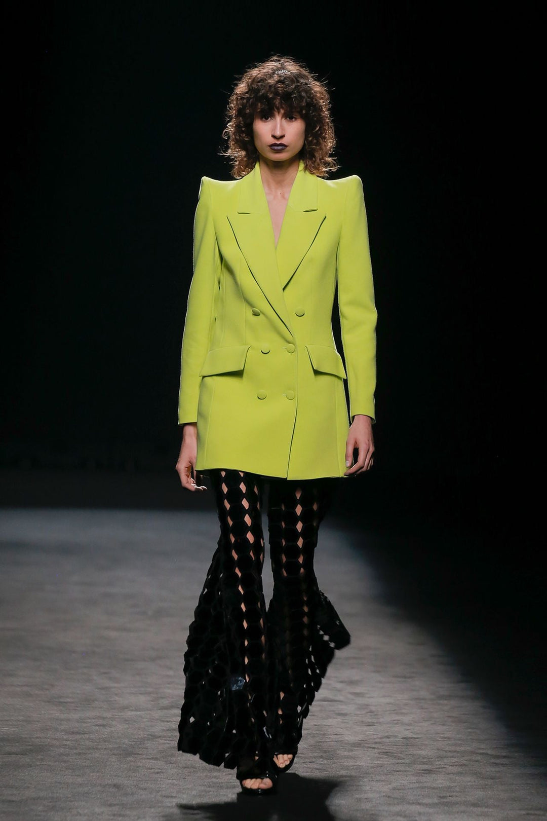 Lime green long blazer with long sleeves, lapels, padded shoulders, side pockets, and buttons. Complemented with flared pants crafted in a geometric pattern revealing cutouts all over.