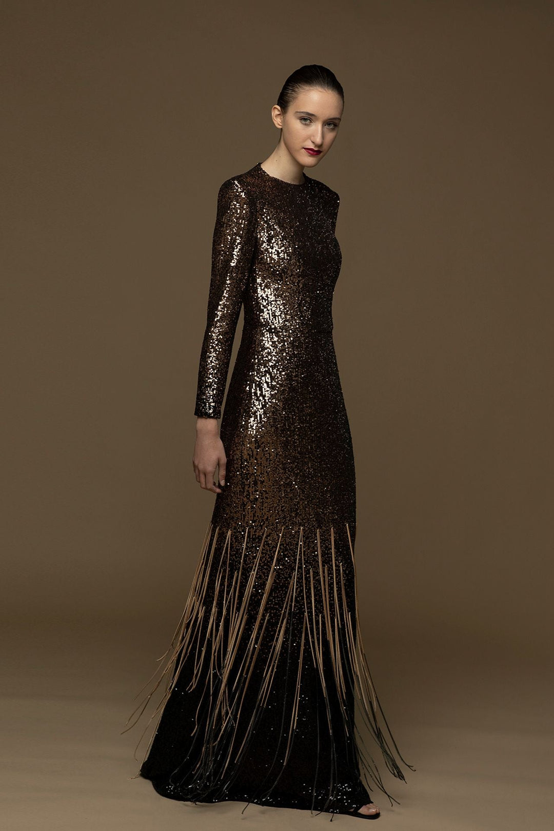 Black and bronze sequined long-sleeved straight-cut dress. Featuring a jewel neckline, long fitted sleeves, a fitted bodice, and a straight-cut skirt that’s half sequined, and half fringed.