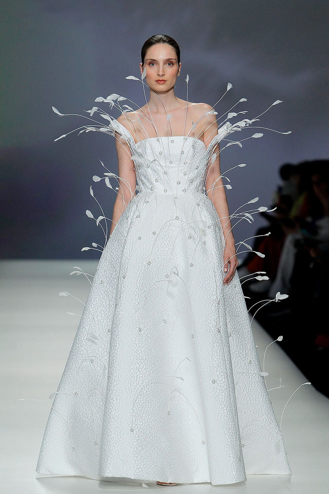 White strapless princess dress. Featuring a straight neckline, a fitted bodice, and a princess-cut skirt. Complemented with pearls and protruding 3D feathers.