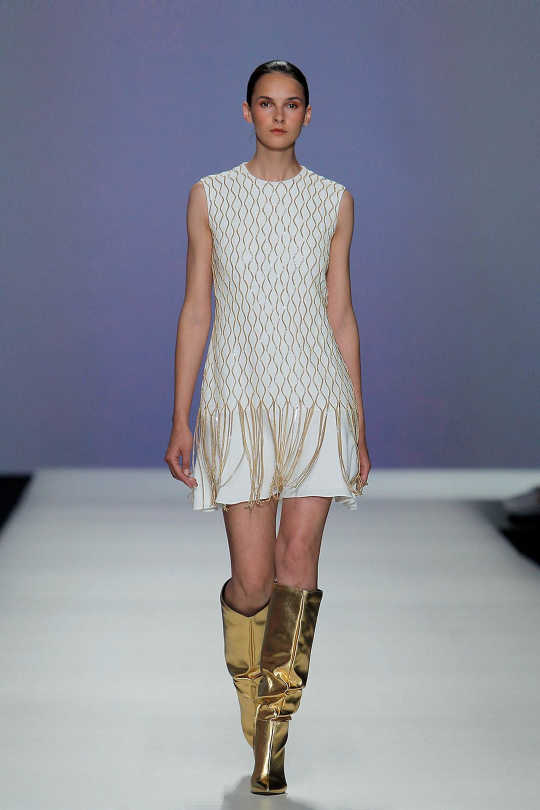 White sleeveless short dress. Featuring a jewel neckline, a fitted bodice, and a short skirt slightly flared. Complemented with a gold net-fabric over it, with fringes at the bottom.