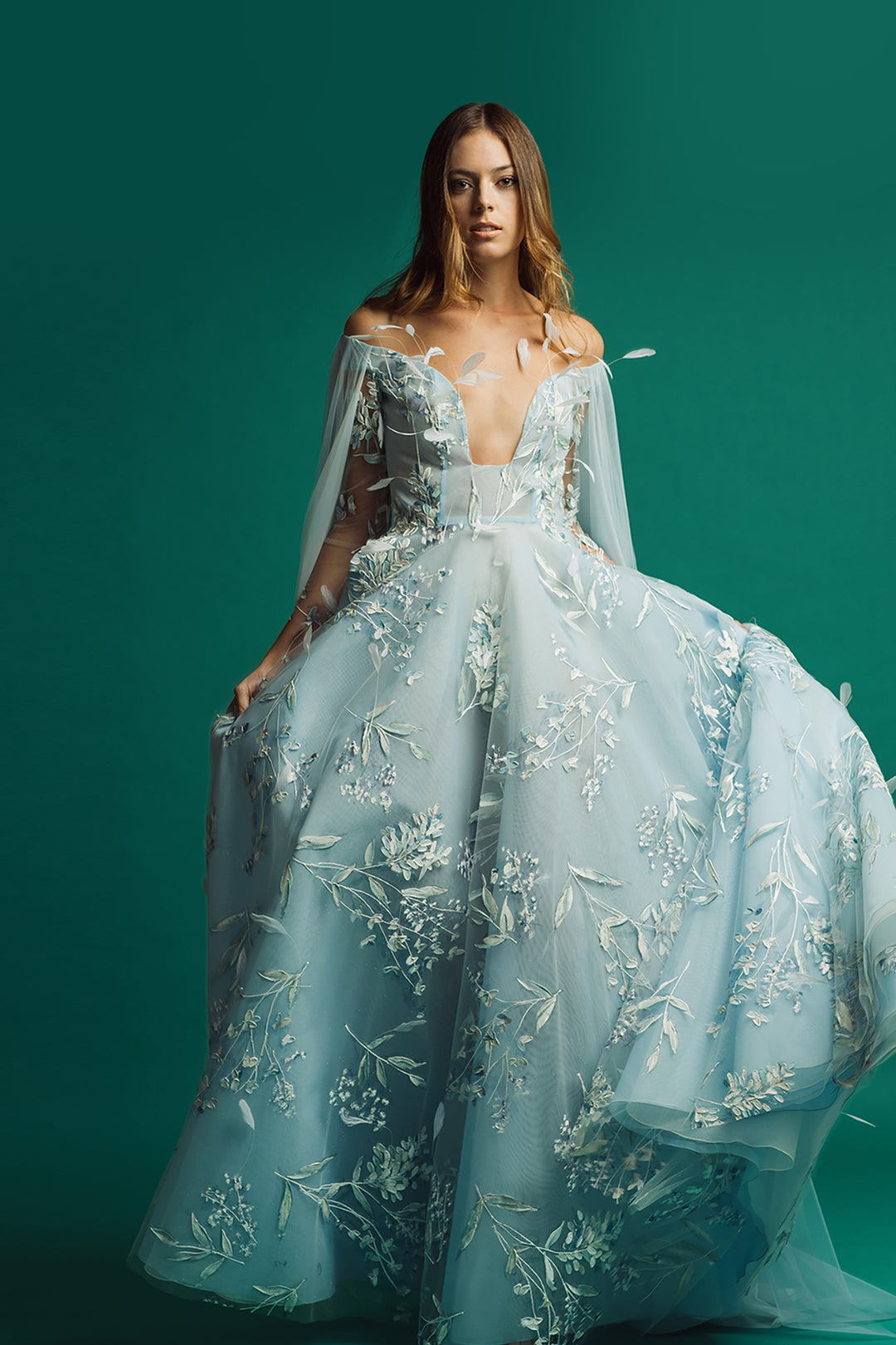 Light blue off-the-shoulder princess-cut dress. Featuring a wide V neckline, and long tulle embroidered sleeves. Complemented with a fitted bodice, and a princess-cut skirt. The dress is embroidered with a floral design, and embellished with feathers. Complemented with a pleated Watteau cape.