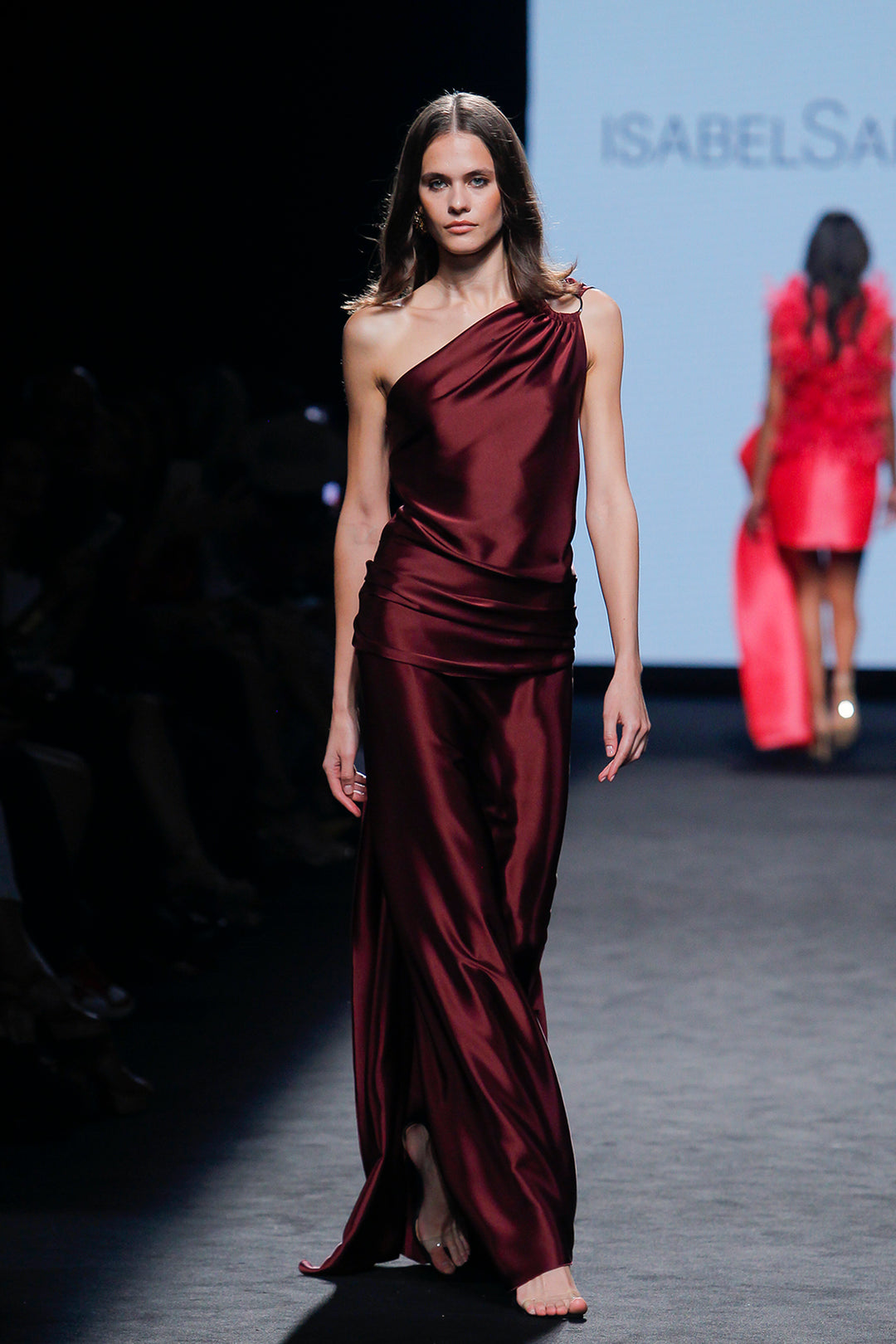 Burgundy one-shoulder jumpsuit. Featuring a sleeveless shoulder, and gathering details on the bodice. Complemented with pleats around the hips, flared pants, and a back flowy train.