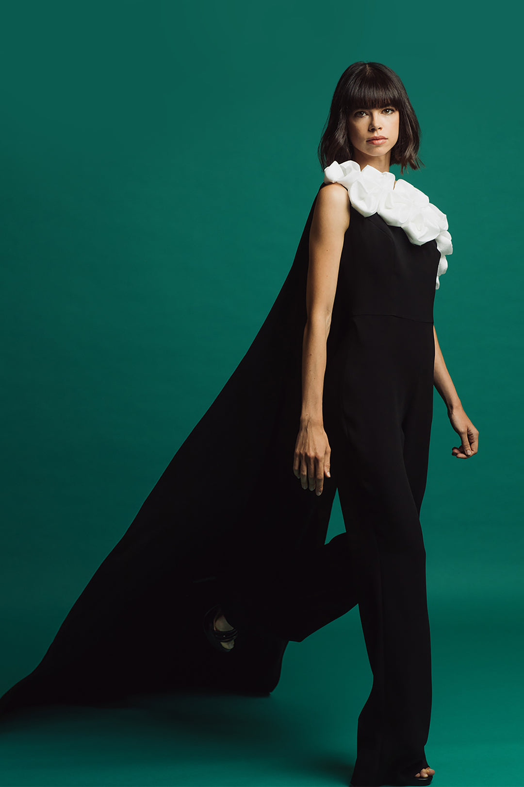 Black sleeveless jumpsuit. Featuring a white ruffled neckline, and a Watteau cape that flows floor-length. Complemented with a straight-cut bodice, and straight-cut pants.
