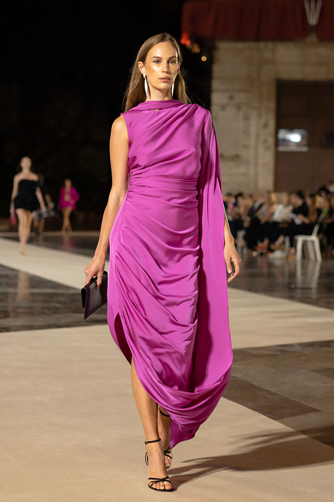 Purple draped midi dress. Featuring a Sabrina neckline, the other shoulder has a cape sleeve connected to the hemline, revealing a draped fabric at one side. Complemented with fitted bodice and skirt with pleats detailing, and a side slit.