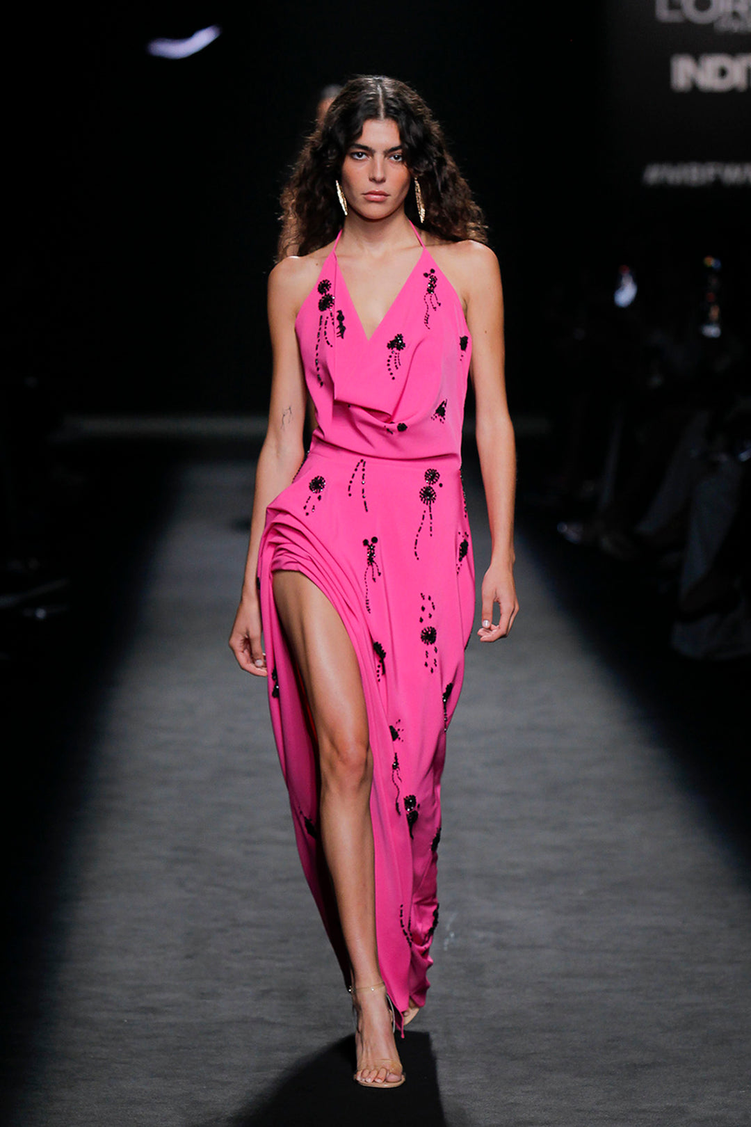 Hot pink halterneck sheath dress. Featuring a draped neckline, and a pleat detail at the waist, separating the bodice from the skirt. Complemented with a fitted sheath skirt, and a thigh-high asymmetric slit adorned with draped pleated on the edges, at the hip. The dress is embellished with black crystal stones.