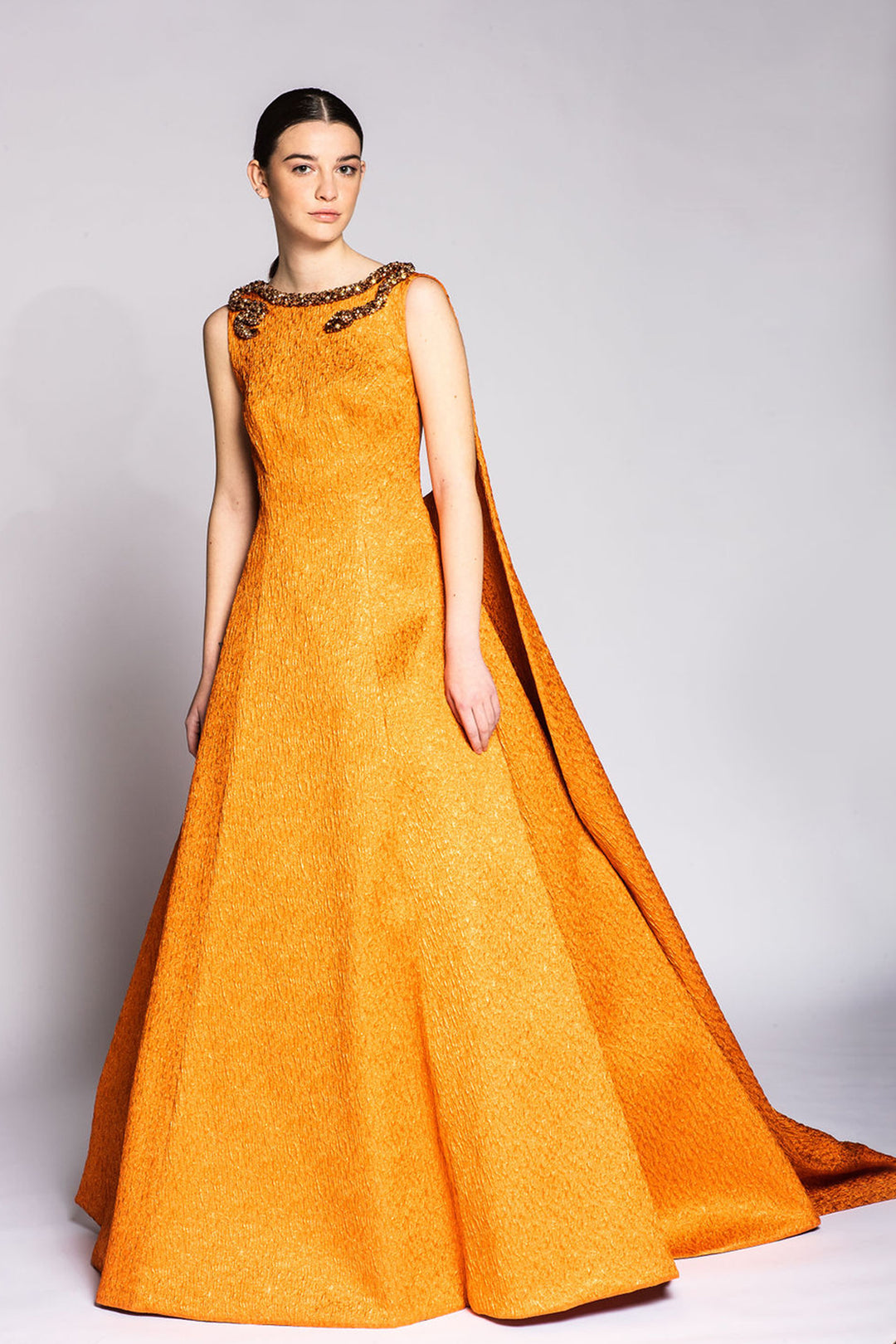 Orange sleeveless princess-cut dress. Featuring a Sabrina neckline, with a gold snake piece around the neck. Complemented with a fitted bodice, and a princess-cut skirt. Completed with a Watteau cape.