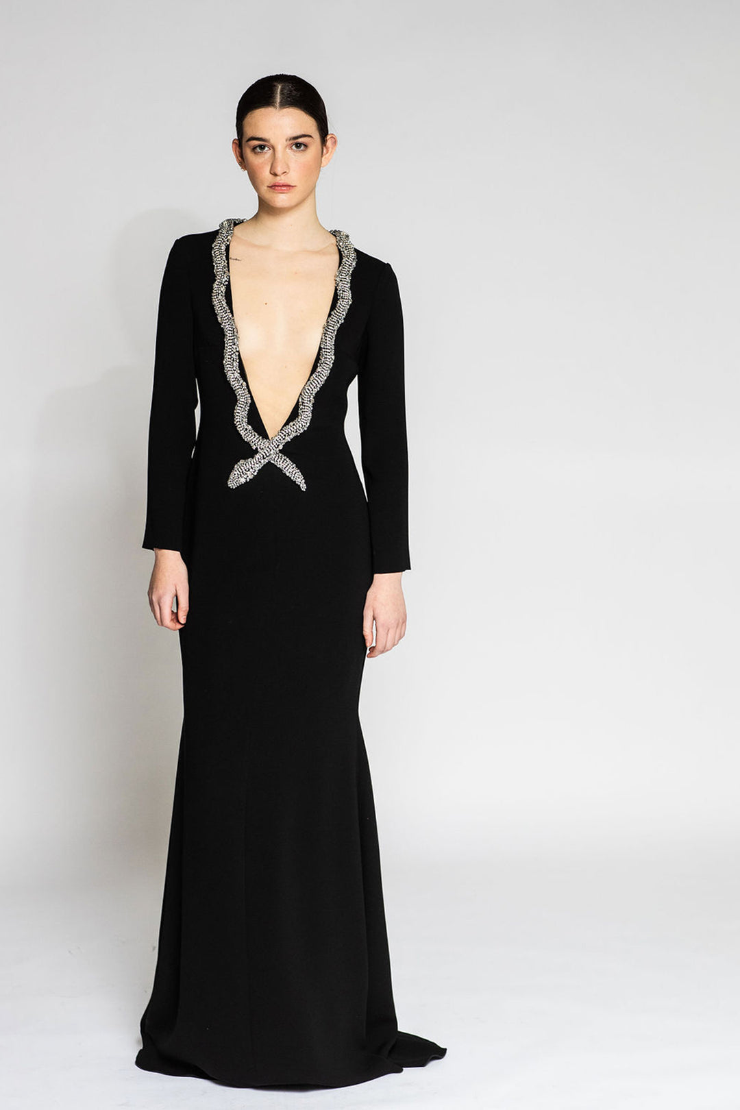 Black long-sleeved mermaid dress. Featuring a plunging wide V-neckline, adorned with a silver snack piece all around the edges. Complemented with long sleeves, and a mermaid skirt.