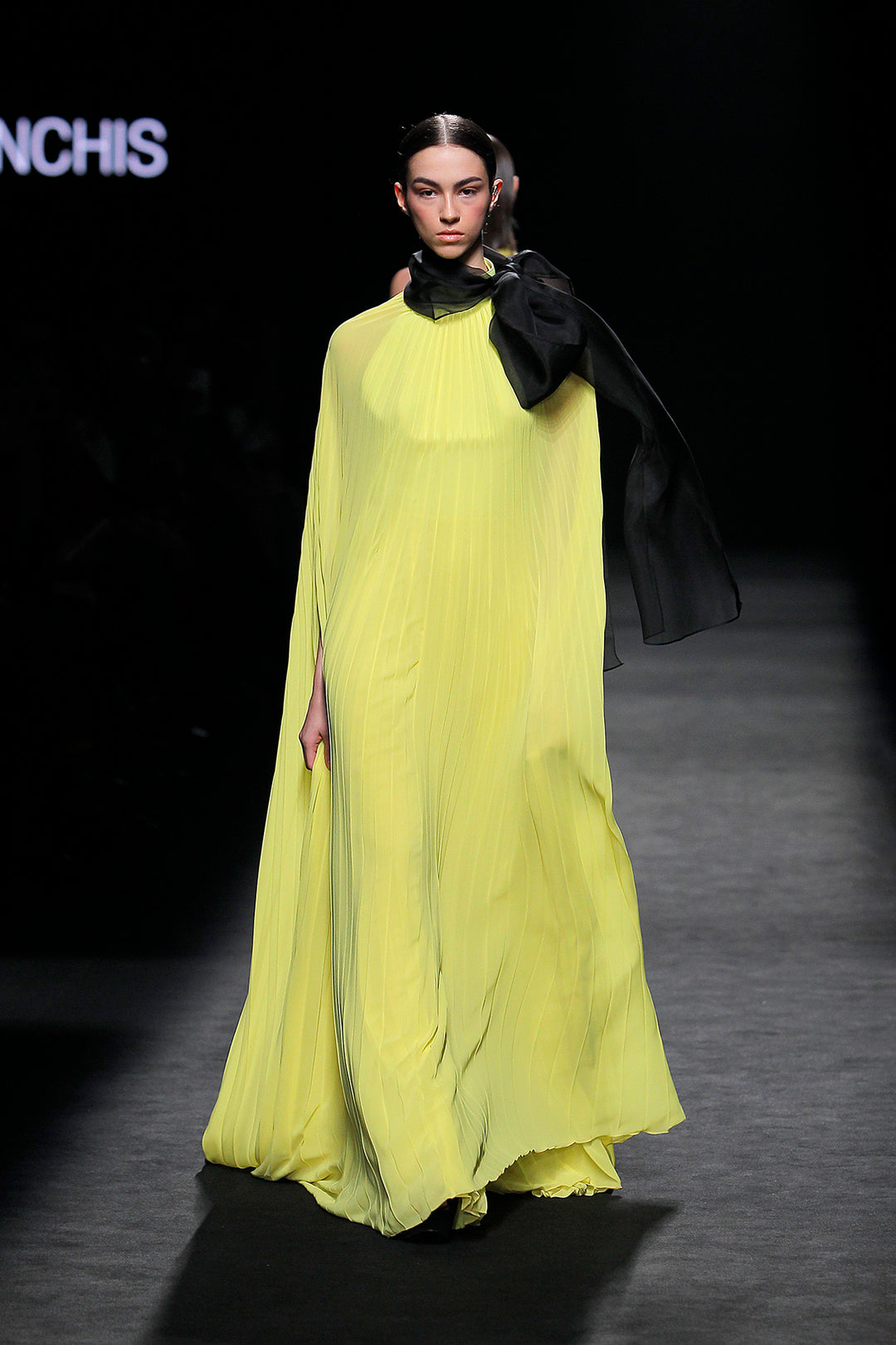 Yellow pleated cloak dress. Featuring a closed neckline with a black tied around the neck loosely and to the side. Complemented with a pleated floor length cloak-like dress.