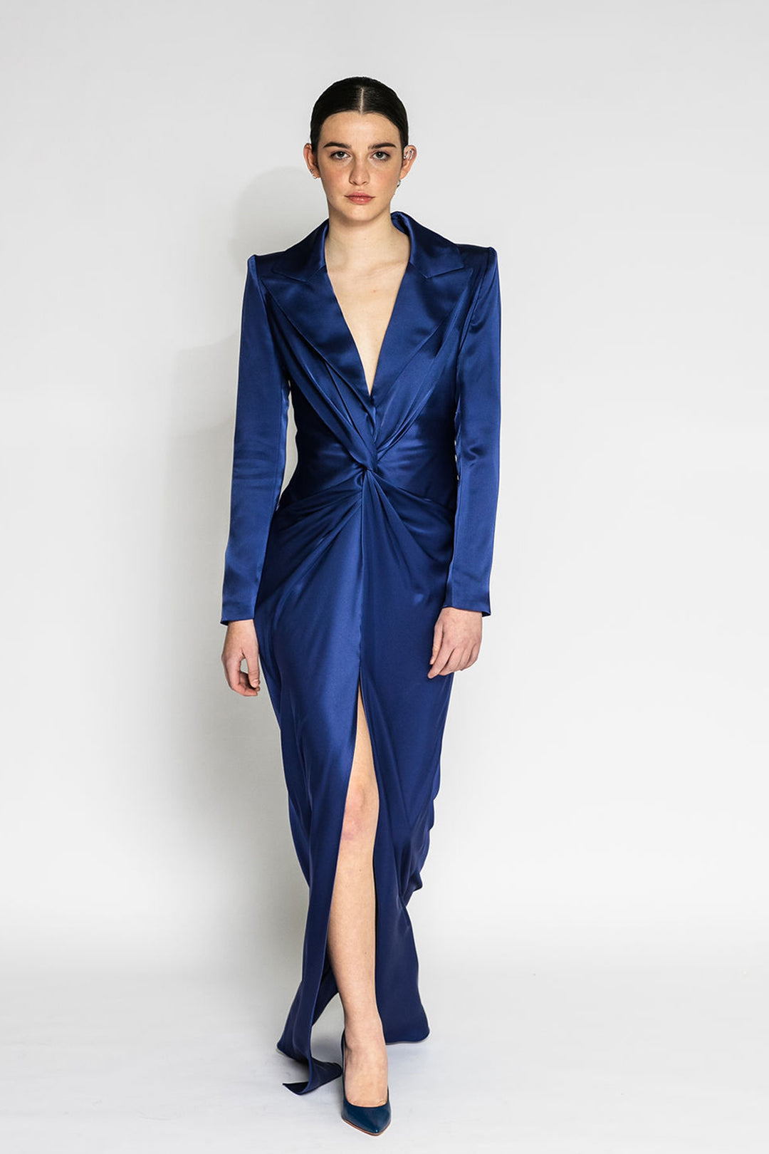Blue long-sleeved draped dress. Featuring a plunging V-neckline, lapels, and long sleeves. Complemented with a fitted skirt, and a front slit. Completed with gathering details around the center.