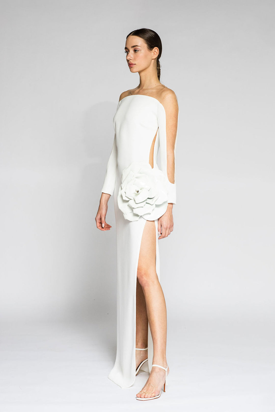 White illusion off-the-shoulder column dress. Featuring one long fitted sleeve, and one sleeve that only has a cuff, revealing the whole side of the arm. Complemented with a side cutout, and a big rose design on the side of the dress, with a side slit.