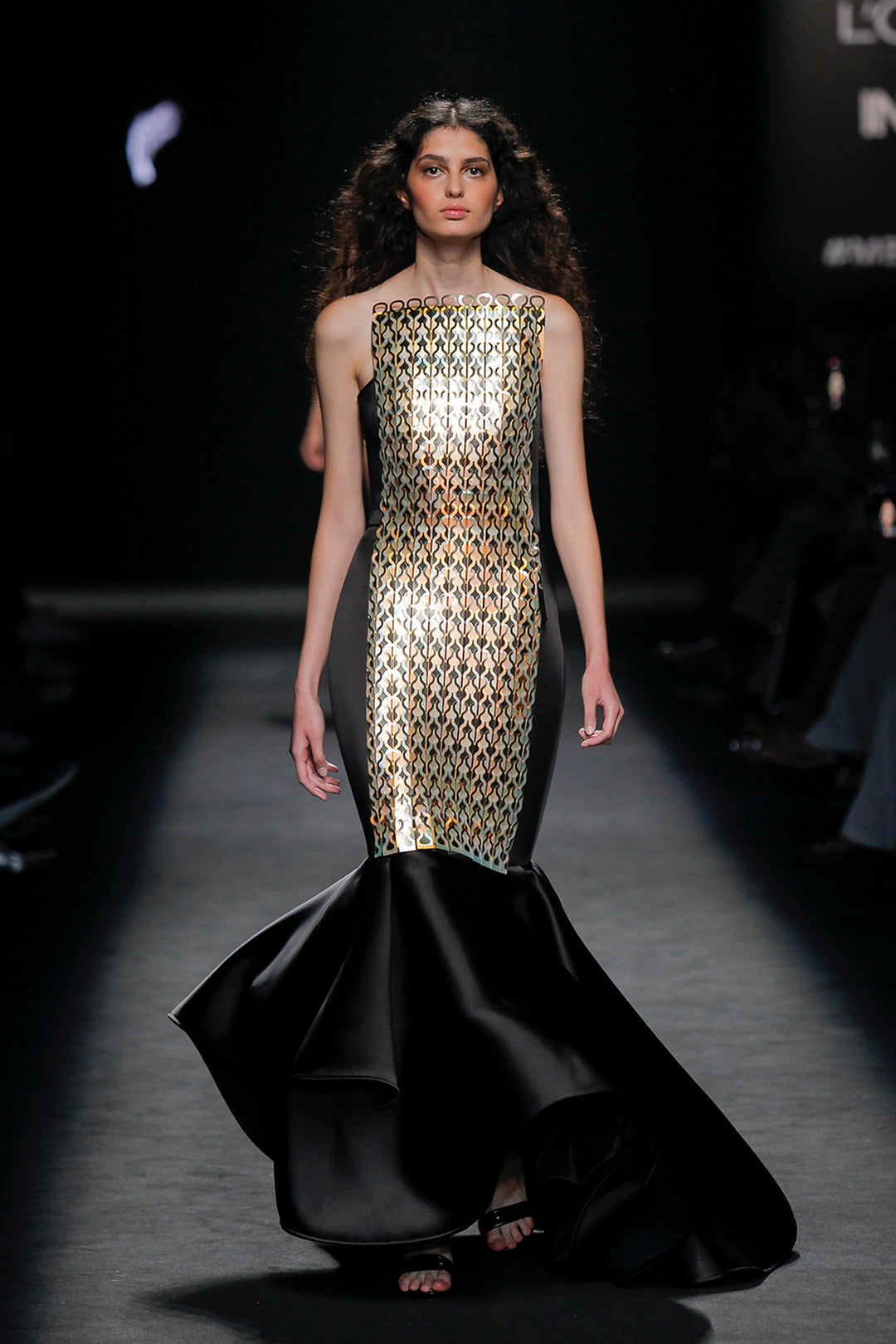 Black and gold strapless mermaid dress. Featuring a straight neckline, a black fitted mermaid dress, with a ruffled hemline. Complemented with a gold armor-like piece from over the neckline to the top of the hemline on the front of the dress.